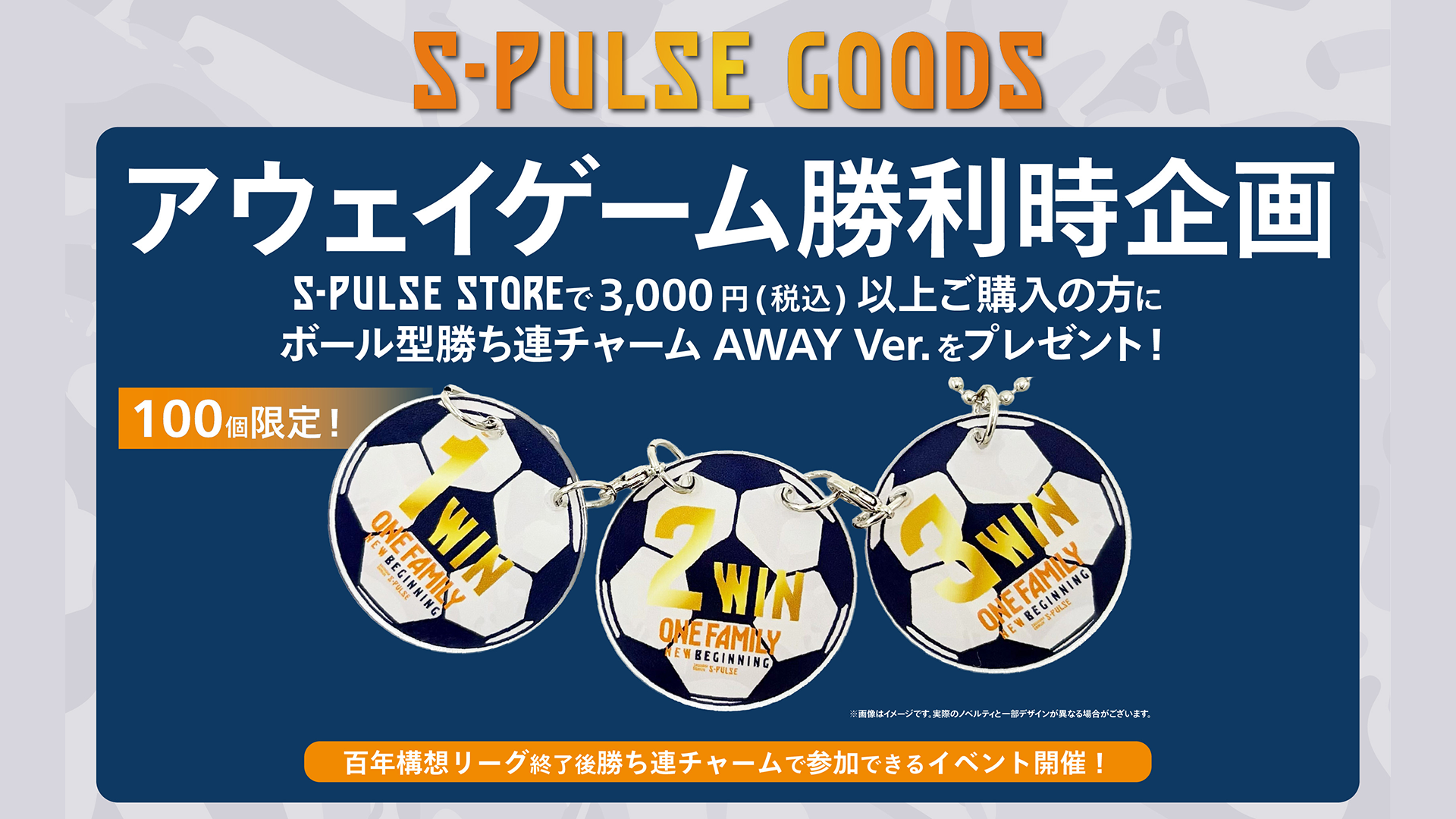 4/5(日)の明治安田J1百年構想リーグ 地域リーグラウンド WESTグループ 第9節V・ファーレン長崎戦(AWAY)に勝利した場合、エスパルスグッズを3,000円(税込)以上ご購入で「ボール型 勝ち連チャーム(非売品)」を先着でプレゼントいたします。勝ち連チャームの表面にはアウェイゲームの勝ち星の数字がデザインされます。