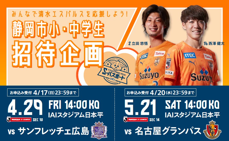 4/29(金祝)サンフレッチェ広島戦・5/21(土)名古屋グランパス戦 静岡市小・中学生限定 親子ご招待企画実施のお知らせ