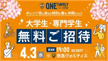 【オレンジ色に染まる特別な春を、仲間たちと!】【 4/3(水)徳島戦】大学生・専門学生 無料ご招待企画実施のお知らせ
