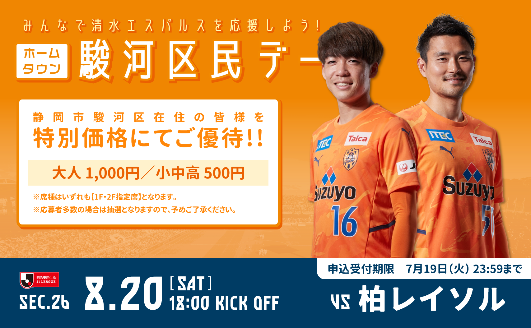 8/20(土)柏レイソル戦 駿河区在住者限定 ご優待企画実施のお知らせ