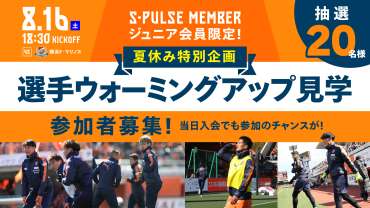 【8/16(土)横浜FM戦】「選手ウォーミングアップ見学」、「選手おもてなしファンサービス 選手と写真撮影会」、「ONE FAMILYビッグフラッグベアラー」、「ハーフタイムバナーウォーク」S-PULSE MEMBER(レギュラー、ライト、ジュニア、法人)限定参加募集のお知らせ