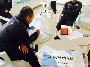 こちらはマックをはさんで相談する佐藤コーチと奥山コーチ