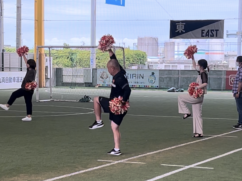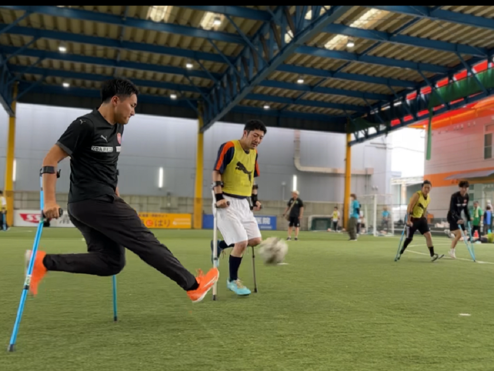 この写真はアンプティサッカーを体験した時の様子です。エスパルスコーチチームで試合に挑みました!どうしても点を取りたかった為、パスを出さずシュートを打ちまくった結果、ゴールは決めましたが1週間くらい事務所でいじられました。。。