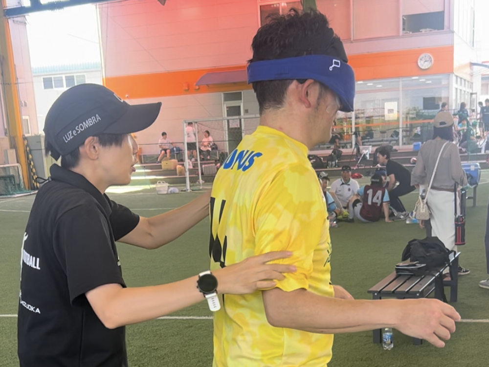 この写真はもりコーチが所属するブラインドサッカーのチームでの様子です。この日はデビュー戦でした。もりコーチの後ろにいるのはアルバイトコーチのゆっきーコーチです。ゆっきーコーチはもりコーチが所属するブラインサッカーのチームの監督です。