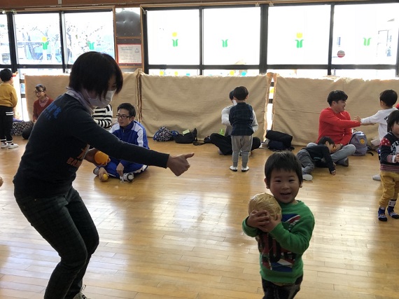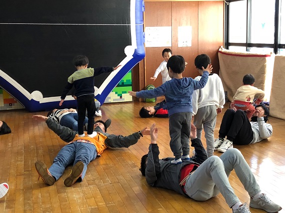 お父さん・お母さんの揺らしたお腹の上から落ちないようにバランスをとったり、家族で協力し、新聞紙で作ったボールでゴールに向かってシュートしたりと、子どもたちは終始笑顔で活動していました。