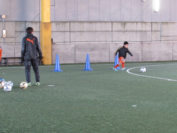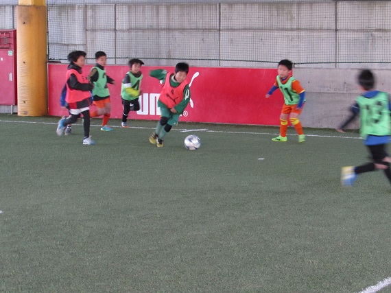 その後はボールを使い、前へ運ぶイメージを持ちながら2つの事を同時に行なう練習をしました。常に周りを観ながらプレーする事を心掛け、コーチから出るたくさんの課題にチャレンジをしていました。