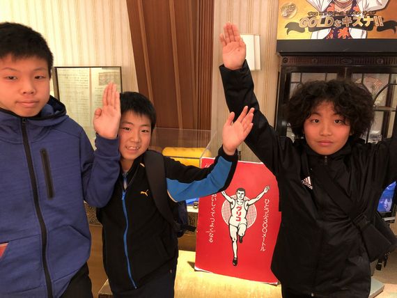 交流戦の後は、大阪のシンボル『通天閣』に観光に向かいました。130mある通天閣の展望台に上がり、大阪市内を一望しました。そして、幸福の女神『ビリケンさん』を中心に記念撮影をし、触ると幸運に恵まれると言われている、ビリケンさんの足の裏をみんなで触りました!