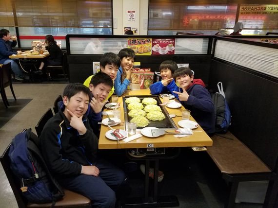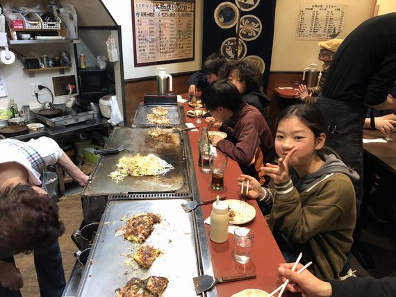 通天閣の後は、大阪の“こてこて”に出会える街『新世界』にて、夕食です。スクール生が2班に分かれて、自分達でお店を選び予算内に食事をしてくる決まりにしました。コーチ達は付き添いますが、後ろから見守りました。なんと、2班が選んだのは両方とも『お好み焼き』でした。大阪の名物を食べてみたかったのでしょうね。名物だけあって、ふわふわでとても美味しかったです。