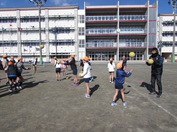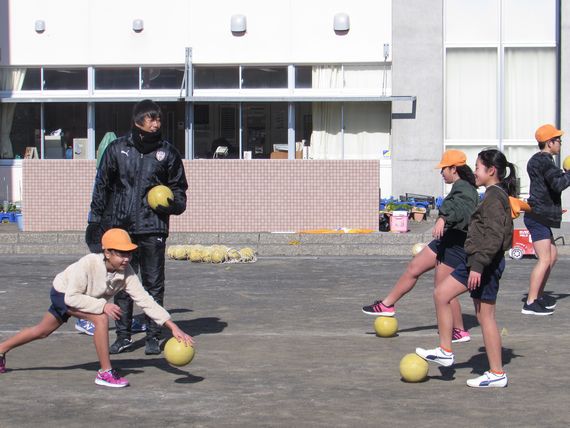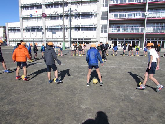 飯田東小学校は、ウォーミングアップは全員で手つなぎ鬼からはじめ、まずは1人ボール1個から、次はペアでボールを扱い、最後はグループに分けてミニゲームをおこないました。