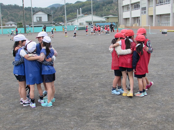 飯田東小学校は6年生73名を対象に、庵原小学校の2年生64名を対象に3、4時間目の体育の時間を利用して一緒にサッカーを楽しみました。どちらの日もとても寒い日で、立っているだけで凍えてしまう日でしたが、元気に楽しく活動してくれました。あまりサッカーをやったことがない生徒も多く、はじめは、苦手意識を持っている子もいましたが、「失敗してもチャレンジしてみよう!」「楽しんでやるのが大切だよ!」と声をかけると、始めから終わりまで、仲間と一緒に笑顔でボールを追いかけ、サッカーを楽しんでくれました。
