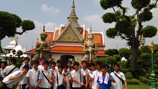 まずは「暁の寺−ワットアルン」です。暁の寺にはチャオプラヤ川を渡るため船に揺られながら向かいました。近くで建造物を見ると、その大きさにみんな興味津々でした。