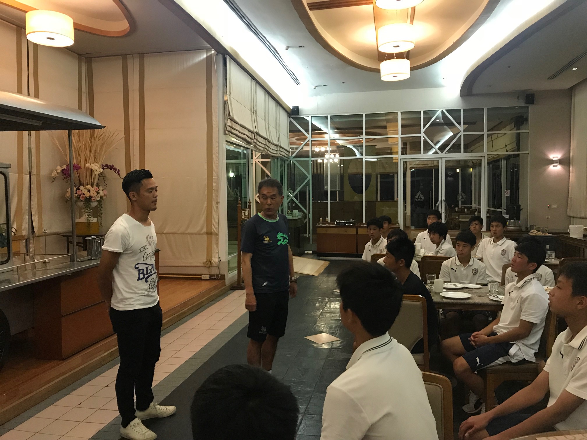 選手たちが夕食を終えるころ、エスパルスジュニアユース出身で現在タイのスパンブリーFCでプレーする赤星貴文選手が激励に駆けつけてくれました。Jリーグの他、海外の数々のクラブで活躍する経験を持つ赤星選手は、
