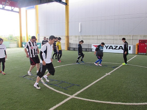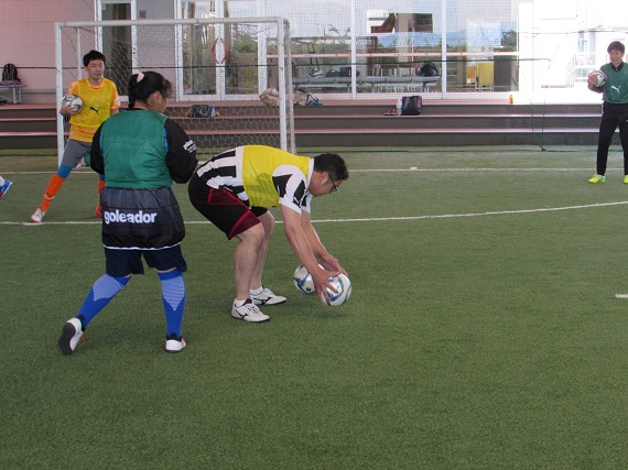 パスのトレーニングでは、足裏でのコントロールに慣れない様子でしたが、1回1回丁寧に扱うことで回数を重ねるたびにうまくなっていく様子が見られました。足裏のみのダイレクトパスでは、相手が次に蹴りやすいように優しくタッチする方が多くいました。最後に連続で30回つなげるというトレーニングではミスがなく、終わった後には自然と拍手がおこり、充実したトレーニングとなったのではないでしょうか。