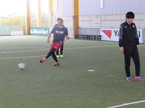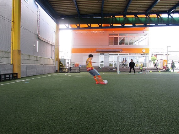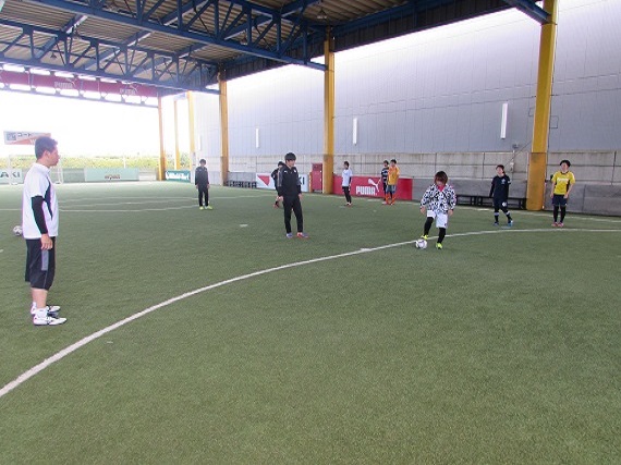 次にシュートトレーニングを実施しました。1度相手のマークを外す動きを入れてから、コントロール、マークを外す動きは、切り返すタイミングやスピードの変化をつけるのが難しい様子でしたが、コーチの真似をしながら何度も取り組んでいました。