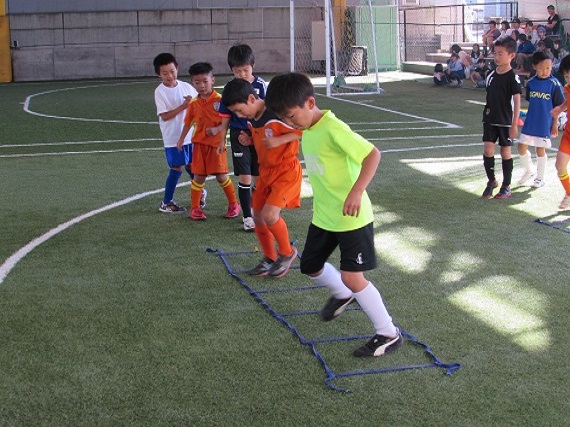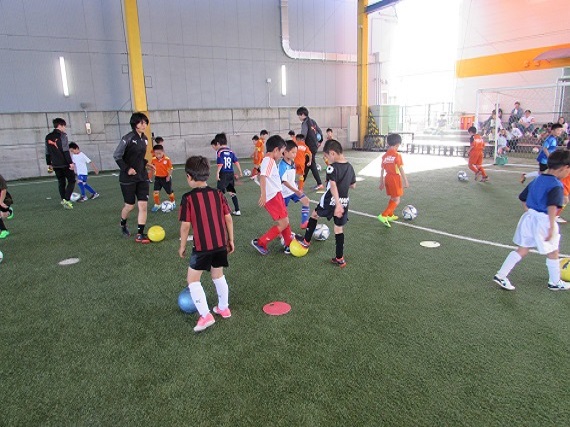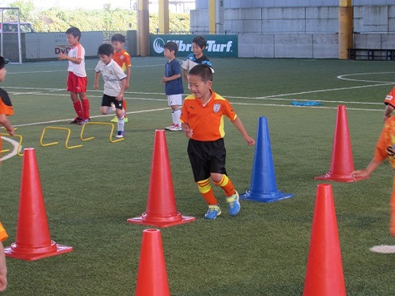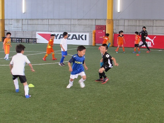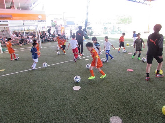 ドリブルのトレーニングでは、様々な条件をつけて行ないました。子どもたちは、ドリブルしながら頭も使うトレーニングに苦戦していました。例えば、コーチが手をあげたらボールに座るという動作。しっかりとコーチを見れる子もいれば、周りが座ったのを見てから座る子もいました。2つのことを同時に行ない、常に頭で考える難しさを感じたのではないでしょうか。