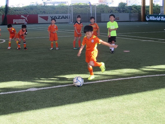 シュートの練習では、足裏でコントロール(なめる動作)をしてからシュート。子どもたちは、足裏でのボールの扱いに慣れてきた様子でした。その中で、どうしたらシュートが打ちやすい所にボールを置けるか、どこにボールを動かしたら自分が1番強いシュートを打てるのかと考える様子も見られました。