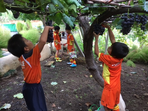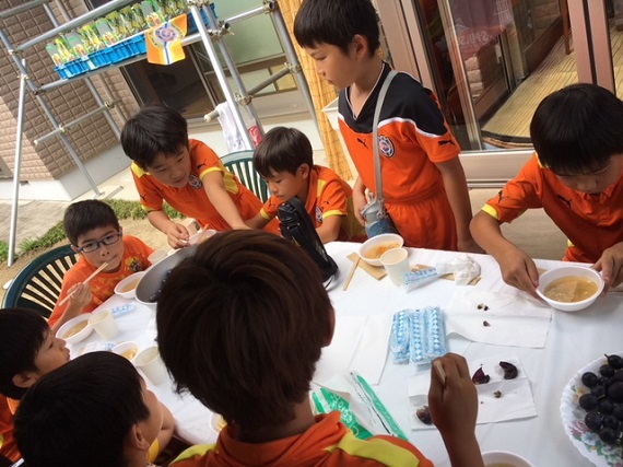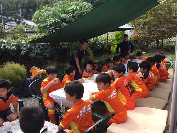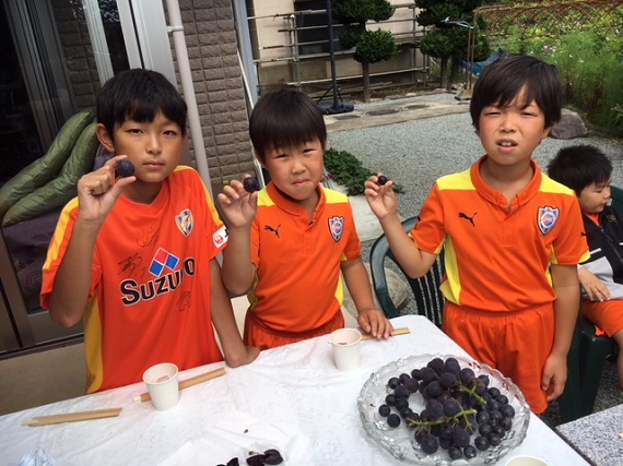 「ぶどうを上手に切るには?」「こっちのぶどうが大きいよ」などと目を輝かせながら、ぶどう狩りを楽しみました。昼食を食べたばかりですが、巨峰とピオーネ、雨宮さんがご用意してくれた無添加ぶどう100%ジュースと豚汁をお腹一杯食べました。また、雨宮さんからぶどうやサッカーの話をたくさん聞く事ができ、お土産のぶどうもいただきました。