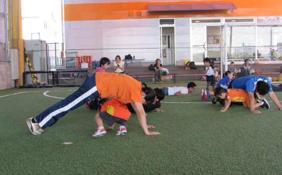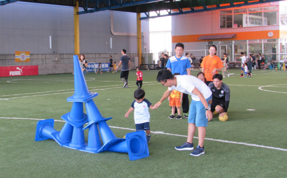 その後は4つのセッションに分かれて行いました。親子で手を繋いでドリブル競争をしたり、コーンをジグザグ走ったり、ジャンプして飛び越えたり、親子で協力して頑張りました。子どもが一生懸命取り組む姿に合わせて、お父さんお母さんも楽しんで取り組んでくれました。