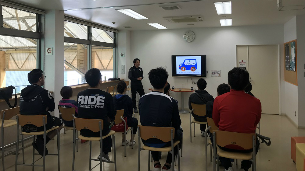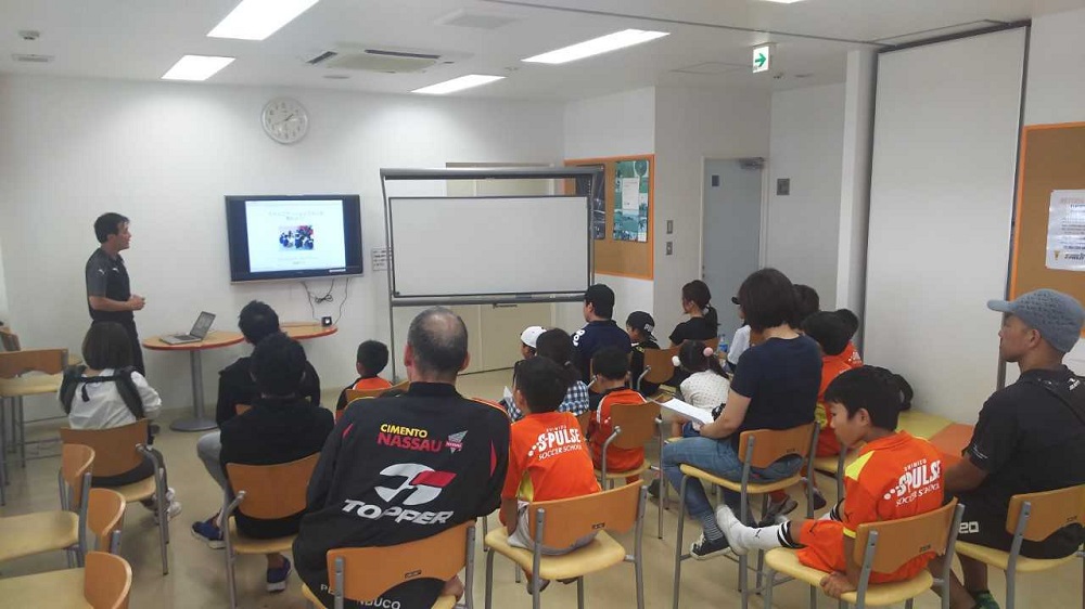 ピッチでの活動に先立ちまして、松尾コーチによるレクチャーが行われました。キッズクラスは保護者を対象に「エスパルススクールライフについて」というタイトルで、なぜ食事や睡眠が大切なのかのお話しをさせていただきました。チャイルドクラスは「コミュニケーションスキルを高めよう!」ということで、親子で物事の捉え方、そしてその話し方の練習を行いました。