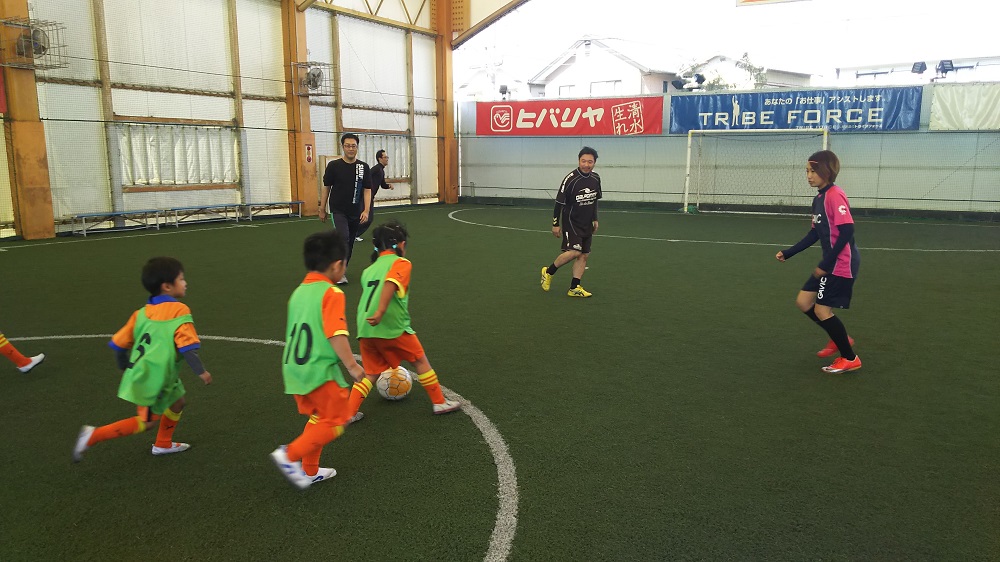 そして、親子で1対1の対決を様々なスタイルで行いました。手によるボールの奪い合いから始まり、身体を入れ合うボールキープ、ドリブルからゴールへシュートなど子どもたちも小さな身体で果敢に勝負に挑んでいました。ときおりチラリと真剣さを見せる親御さんの表情が印象的でした。