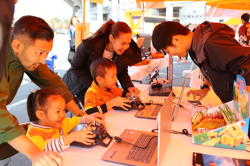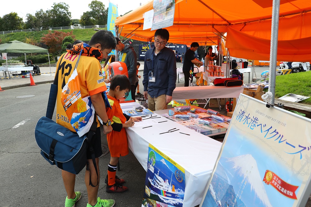 「ロータリーブース」では株式会社コーチョー様/ペットのすずき様、株式会社エスパルスドリームフェリー様、駿河健康ランド様、駿府匠宿様、豊富ドローンスペシャリスト育成スクール様、株式会社M y u/ウルトラ車検様、株式会社サードプラネット様、静岡市こどもクリエイティブタウンま・あ・る様、大和ハウス工業株式会社様、御菓子庵 田子の月様、藤うさぎ整骨院様、自衛隊静岡地方協力本部様、清水警察署様、エスパルスドリームレーシング様、エスパルスドリームプラザ様にご協力をいただき、それぞれの場所でブースを設置してイベントを盛り上げてくださり、参加者のみなさんは楽しい時間を過ごしていました。また、株式会社ドリームプラザ様より人気キャラクター ちびまるこちゃんが来場、エフエムしみず様にはエスパルス応援番組「Go Go S-PULSE」用に当日の様子を参加者にインタビューしていただきました。