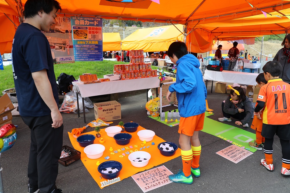 「テニスコートイベント」では、‘参加者の中で1番の親子ペアーとなれ!’を目標に親子でリフティングの数を足して記録を出すカルティーバチャレンジをはじめ、今年もテニス協会様のご協力を得て『テニス体験』コーナーや、ま・あ・るふわふわバルーン体験、そして親子でボール運び、キックターゲット、玉入れ、目隠しシュート、スピードガンの5つの『サッカーアトラクション』が行われ、親子で協力して楽しく取り組んでいる様子でした。