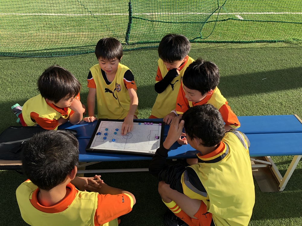 1周目のリーグ戦が終了した時のエリア対決の途中経過は、どちらも「1勝1敗1分」でした。2周目に入ると、1周目で敗れてしまった相手にリベンジできることもあり、休憩の時間には作戦を練って試合までの時間を有効に使っていました。作戦ボードを使い、ポジションのことを話しているチームもあれば、「コートの広いところ使おう」など上手くいかなかったところをどうすればいいのかを話していたチームもありました。「リーグ戦だから点をたくさん取った方がいいのか!」、「点を取られるのも少なくしよう!」と勝負にこだわりながらも上位になるためにどう戦うのかコーチのアドバイスを聞きながら考え、試合をしているように感じました。