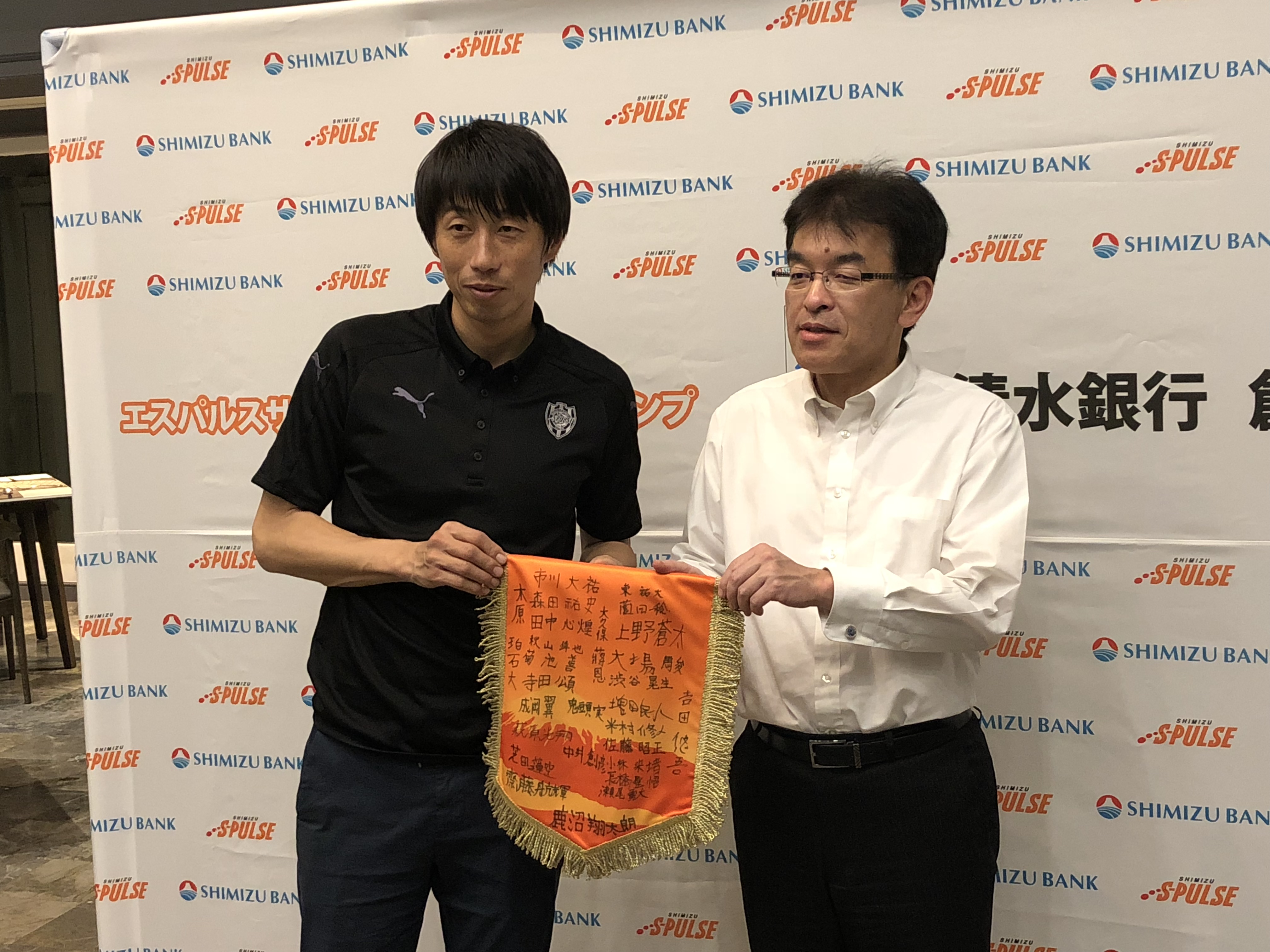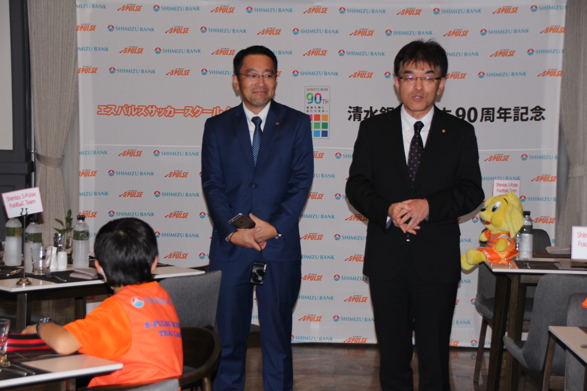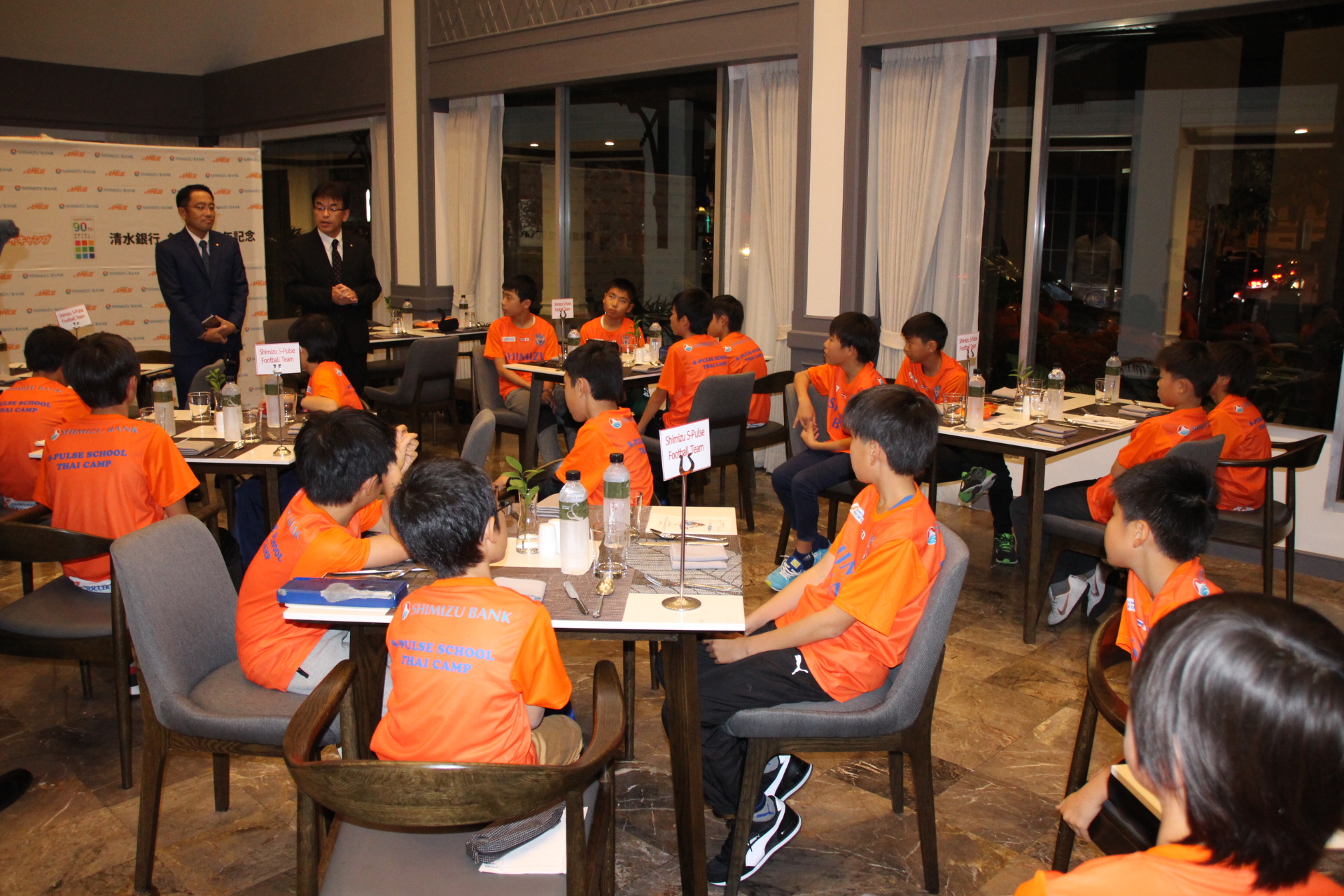「清水銀行は今年90周年を迎えました。色々な事業をやっていますが、その最後を飾るイベントになります。これから10年後の100年まで頑張っていきたいですが、その頃に社会で出る皆さんの成長に役立てたいと思い、今回のイベントを行いました。私から3つ、親御さんに代わって学んでもらいたいことがあります。1つ目は、サッカーは言葉以上に大切なものがある。サッカーを通して友情や言葉以上のものを得てください。2つ目は異文化に直接触れること。明日から試合をする人たちは皆さんと同じ11歳、12歳です。皆さんは同じ数の春夏秋冬の季節を感じています。しかしタイはずっと夏です。今はクリスマスですが、皆さんは寒いときになりますが、タイは暑い中で迎えます。そういうことを直に学んでもらいたいです。3つ目は外国から日本を見た時に見方が変わるということです。外国に来て、日本と比べて色々学んでもらいたいと思います。ぜひ、充実なキャンプを過ごしてください」