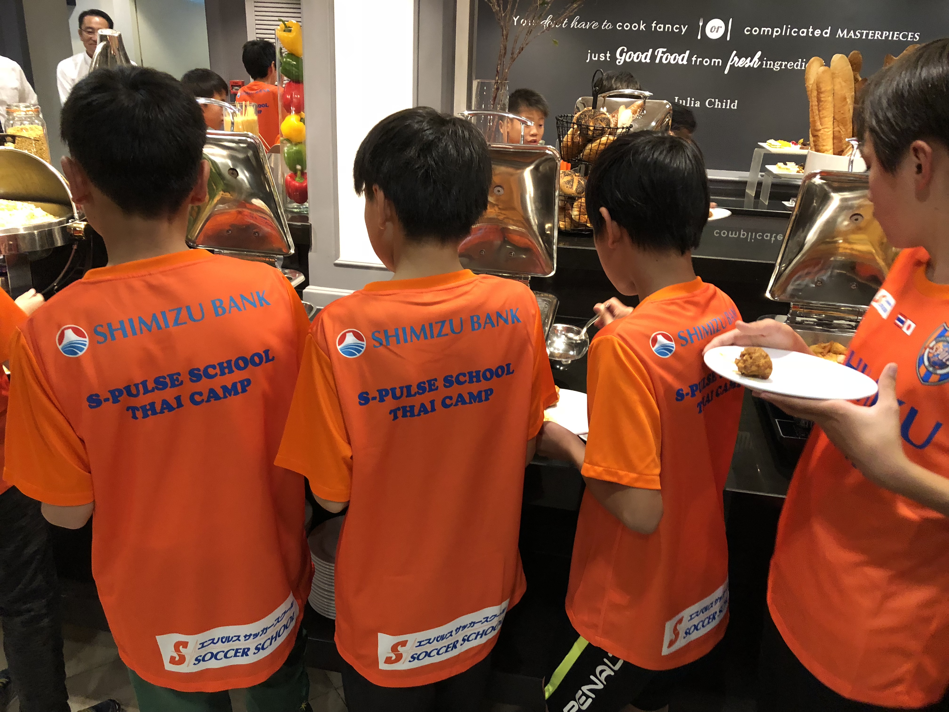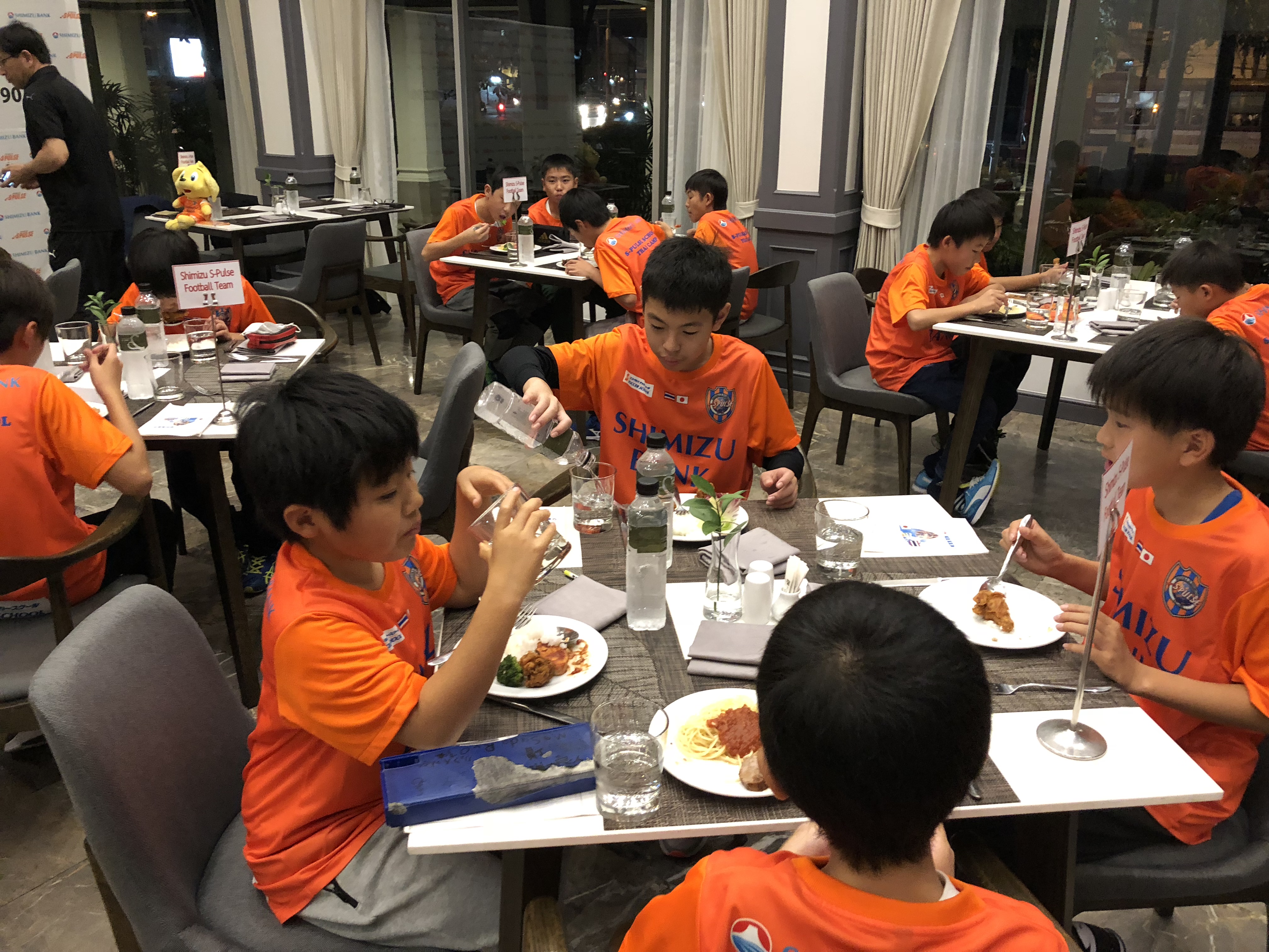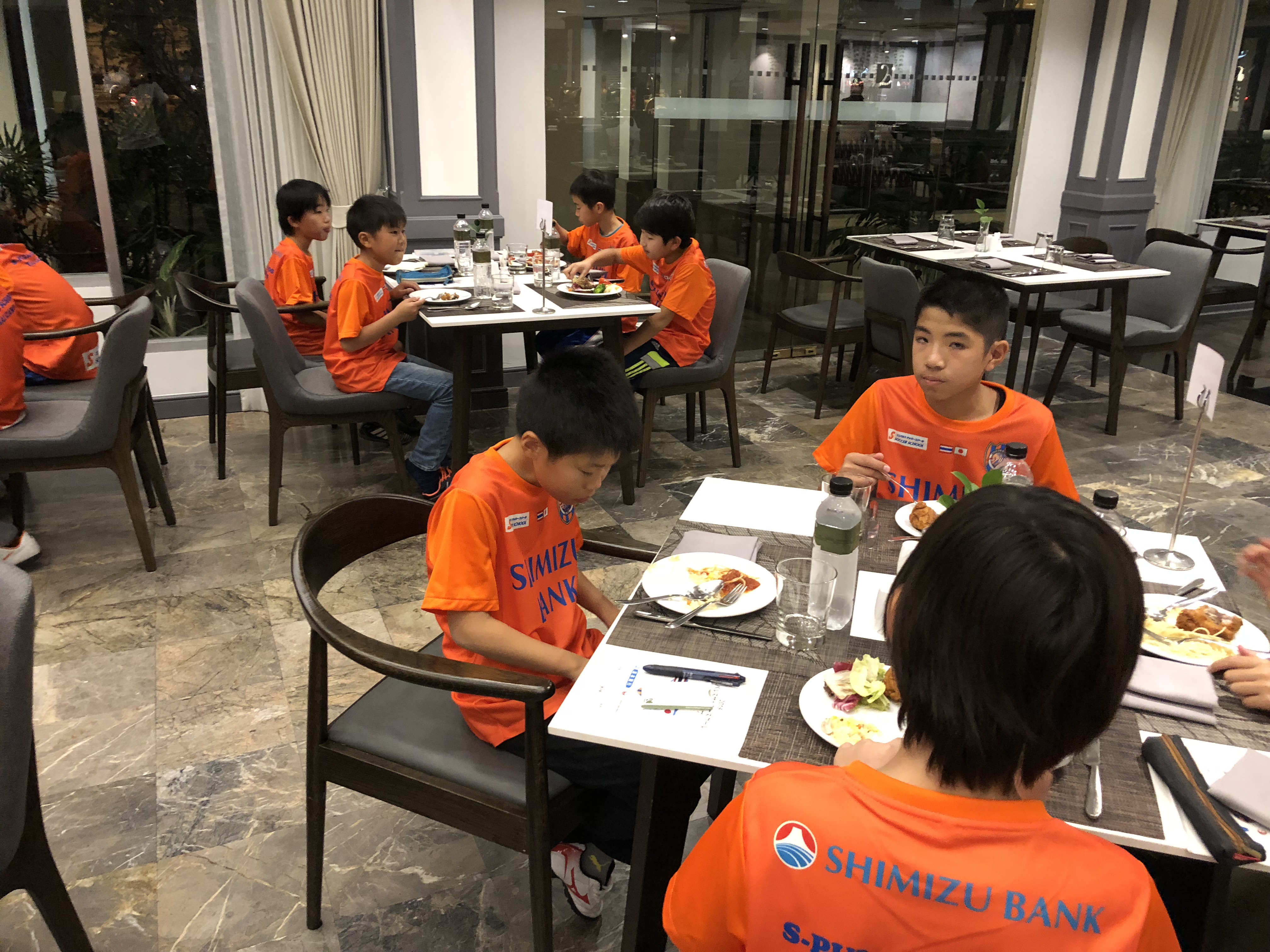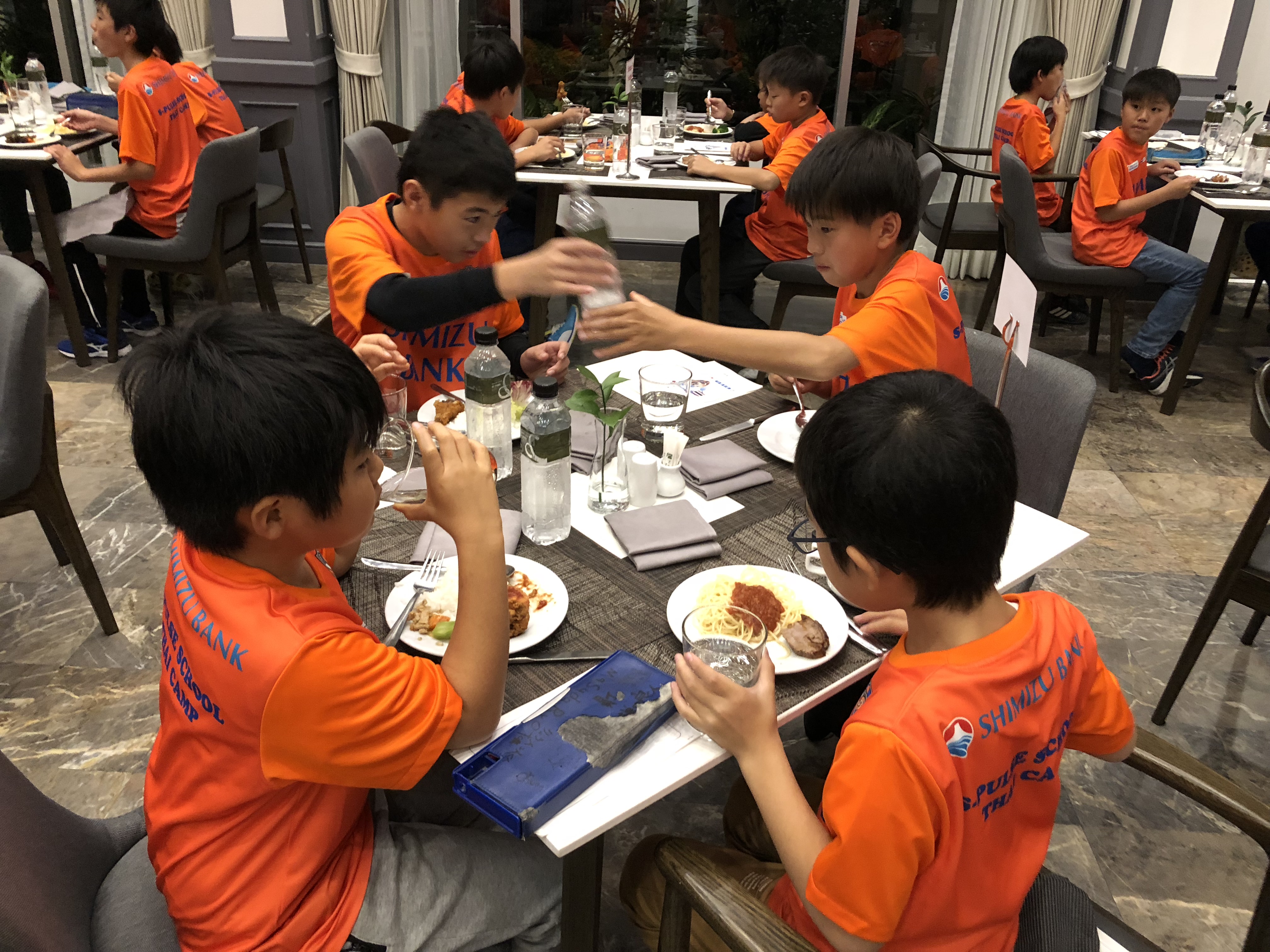 その後、タイキャンプ中のフレンドリーマッチで着用するオリジナルシャツがスクール生に手渡され、最後に全員が自己紹介と今回のキャンプでのテーマややりたいことを述べ、食事がスタートされました。