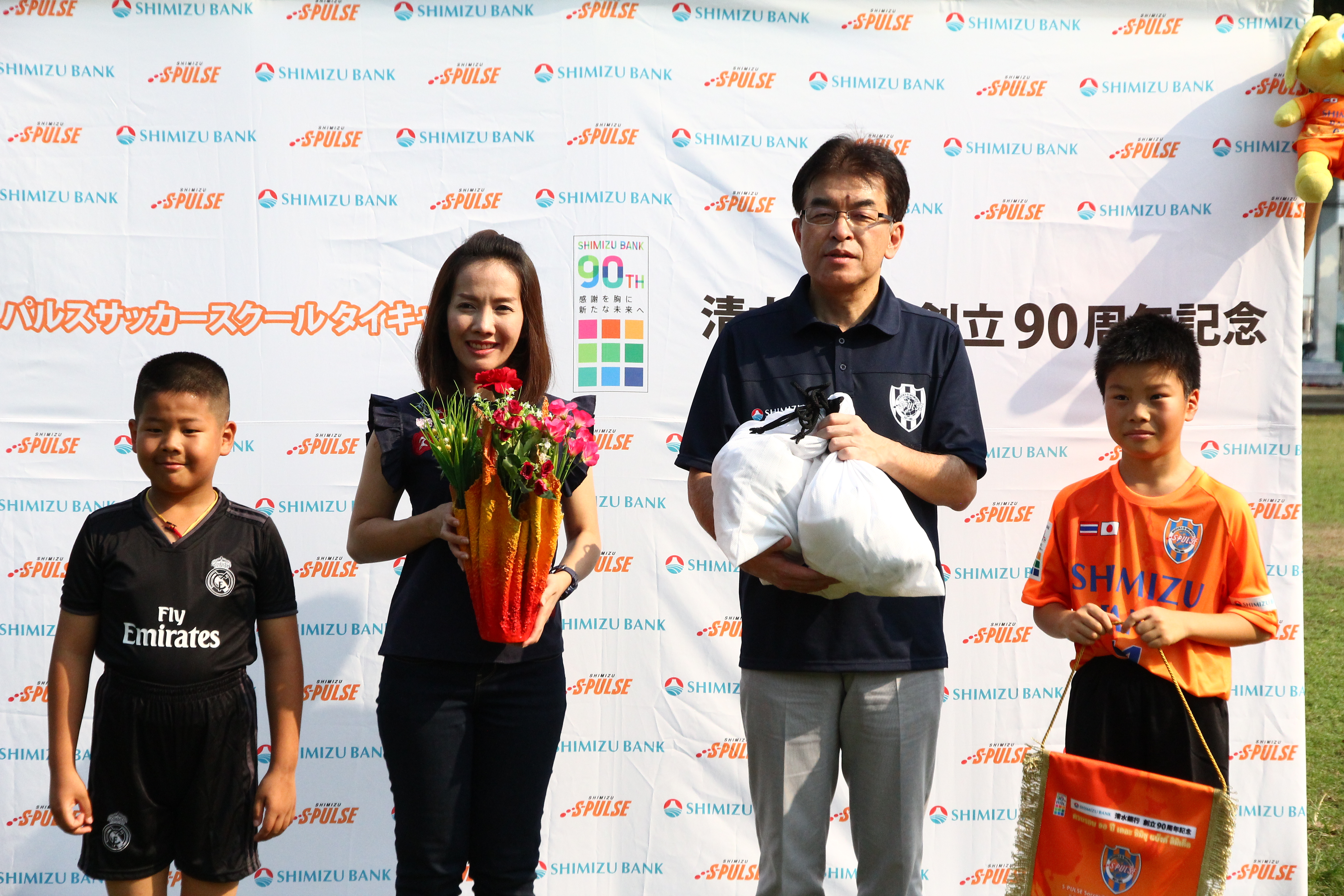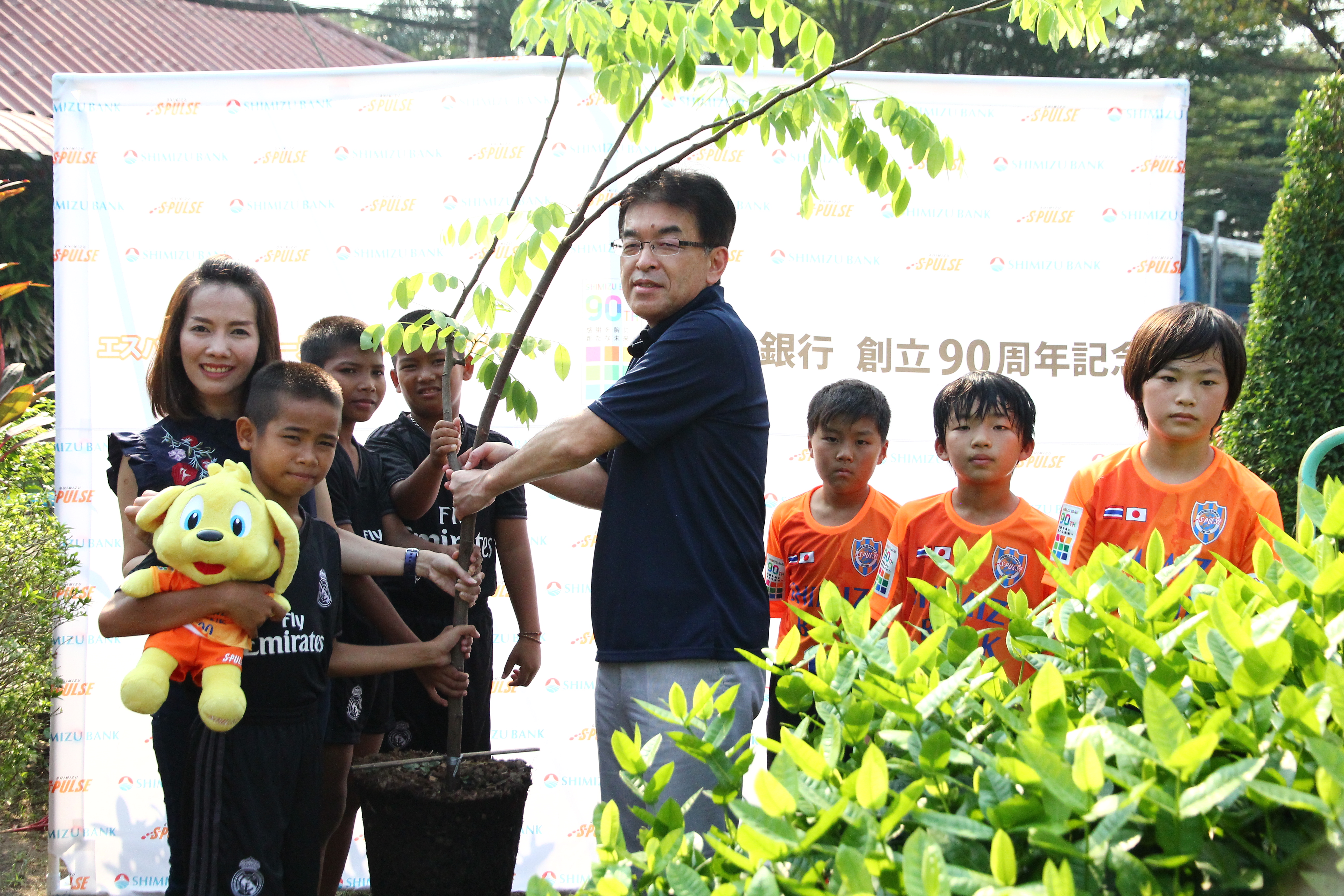 前日に引き続き、清水銀行望月文人専務取締役と諸田幸生タイ駐在員事務所長も訪問いただき、試合開始前に90周年記念の植樹を行いました。施設長から「子供たちは今日を大変楽しみにしていました。このようなイベントをサポートしていただけるということで心からお礼申し上げます」とお礼が述べられました。