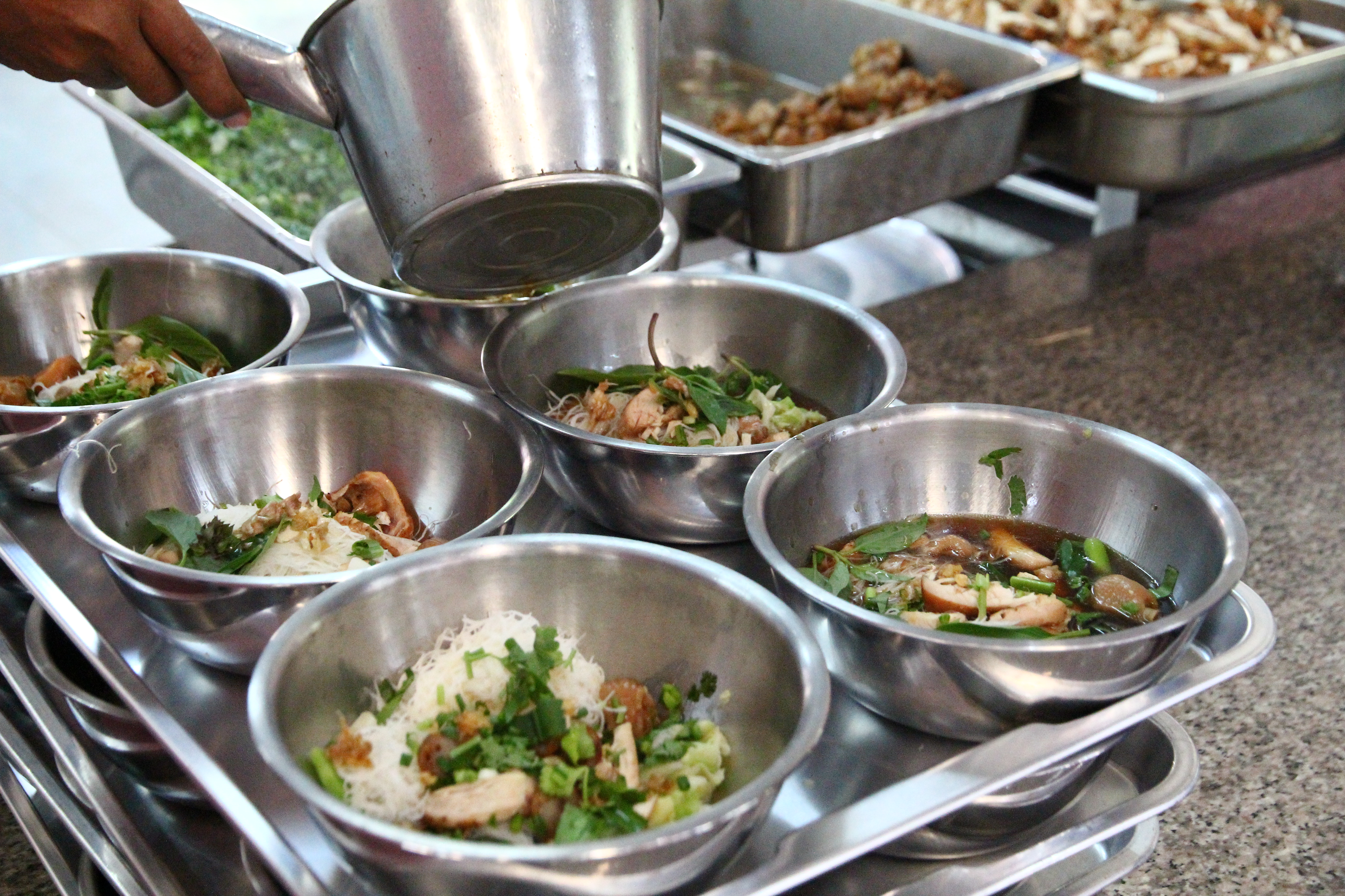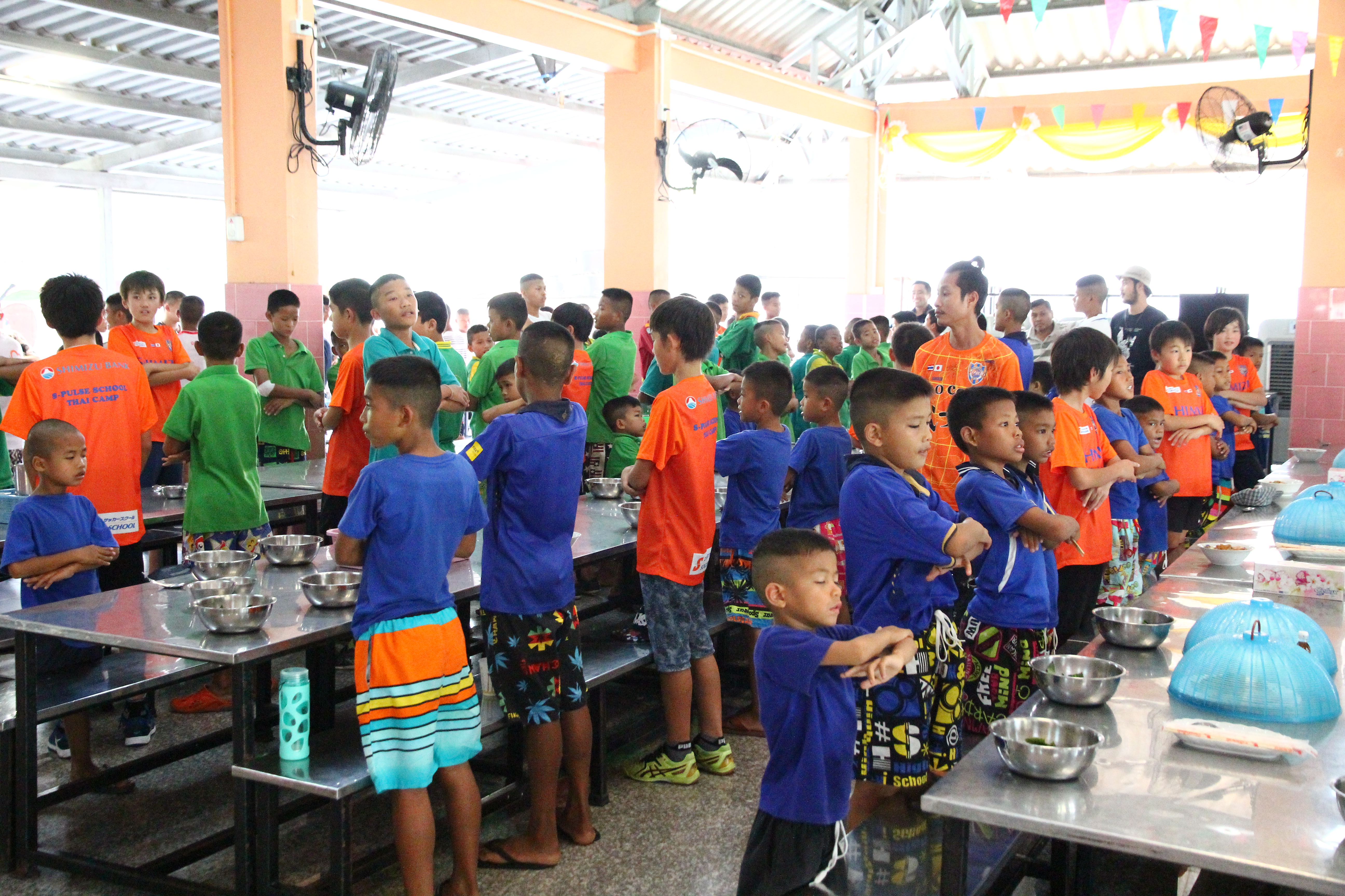 昼食は同施設内の食堂で、施設の子供たち約100人とスクール生が交じり合いながら着席。上級生によって給仕されたタイ風ラーメンを初めは固い表情で食べていたスクール生でしたが、食事後、食堂内に軽快な音楽が流されると、踊り出した子供たちに促され、スクール生も徐々にダンスに参加。初めは照れていたスクール生も気さくな施設の子供たちに手ほどきされ、楽しそうに体を動かしていきました。