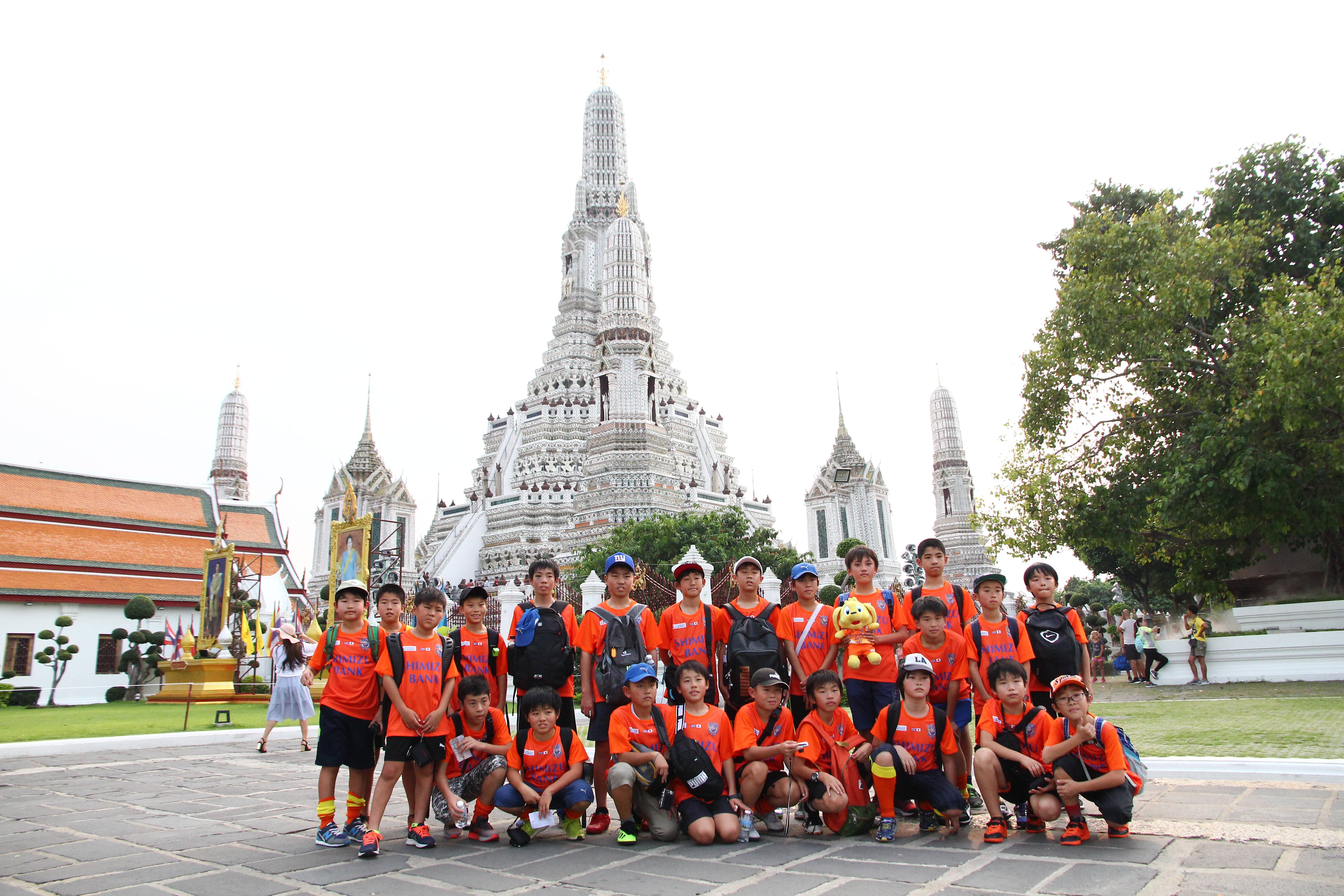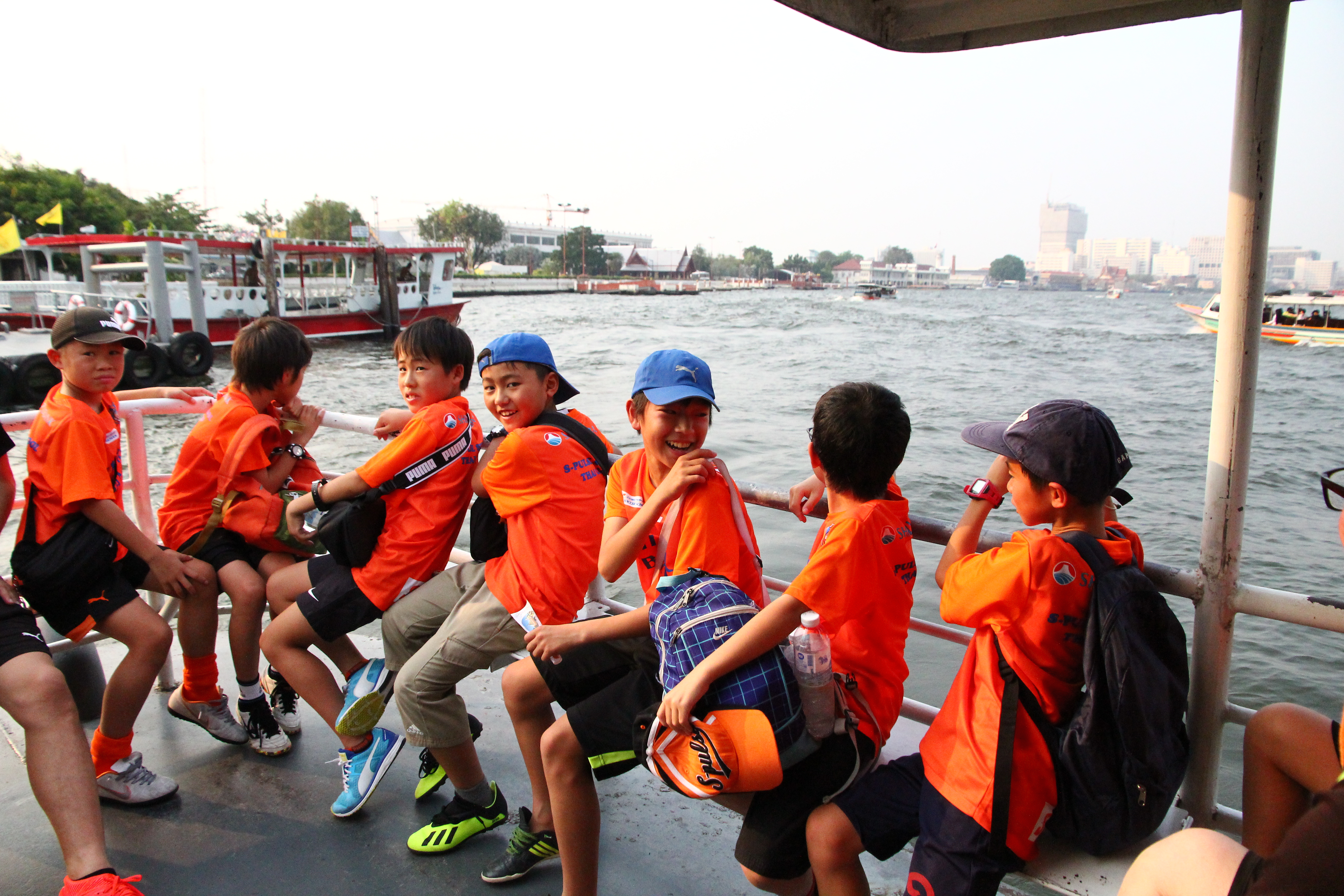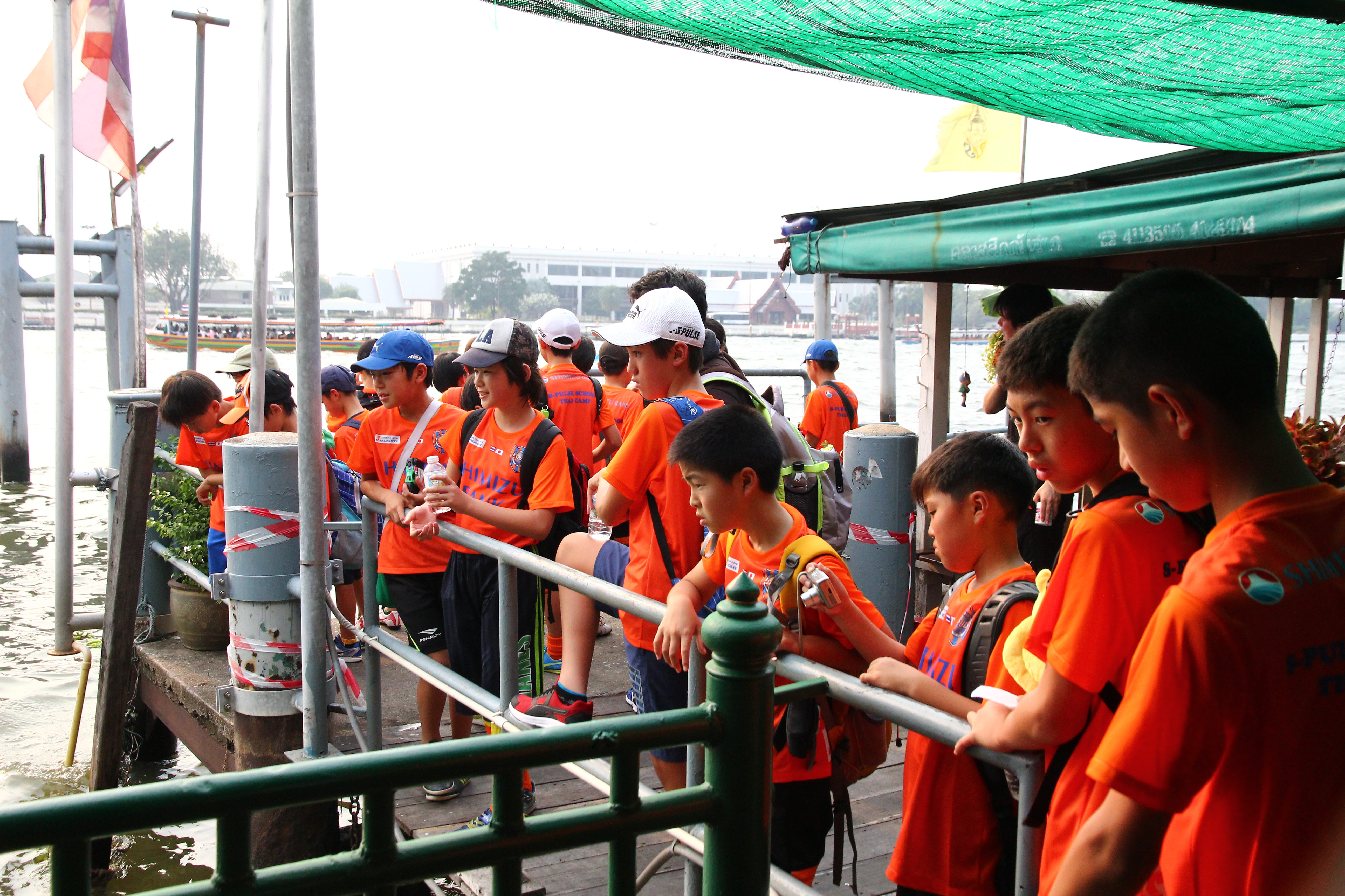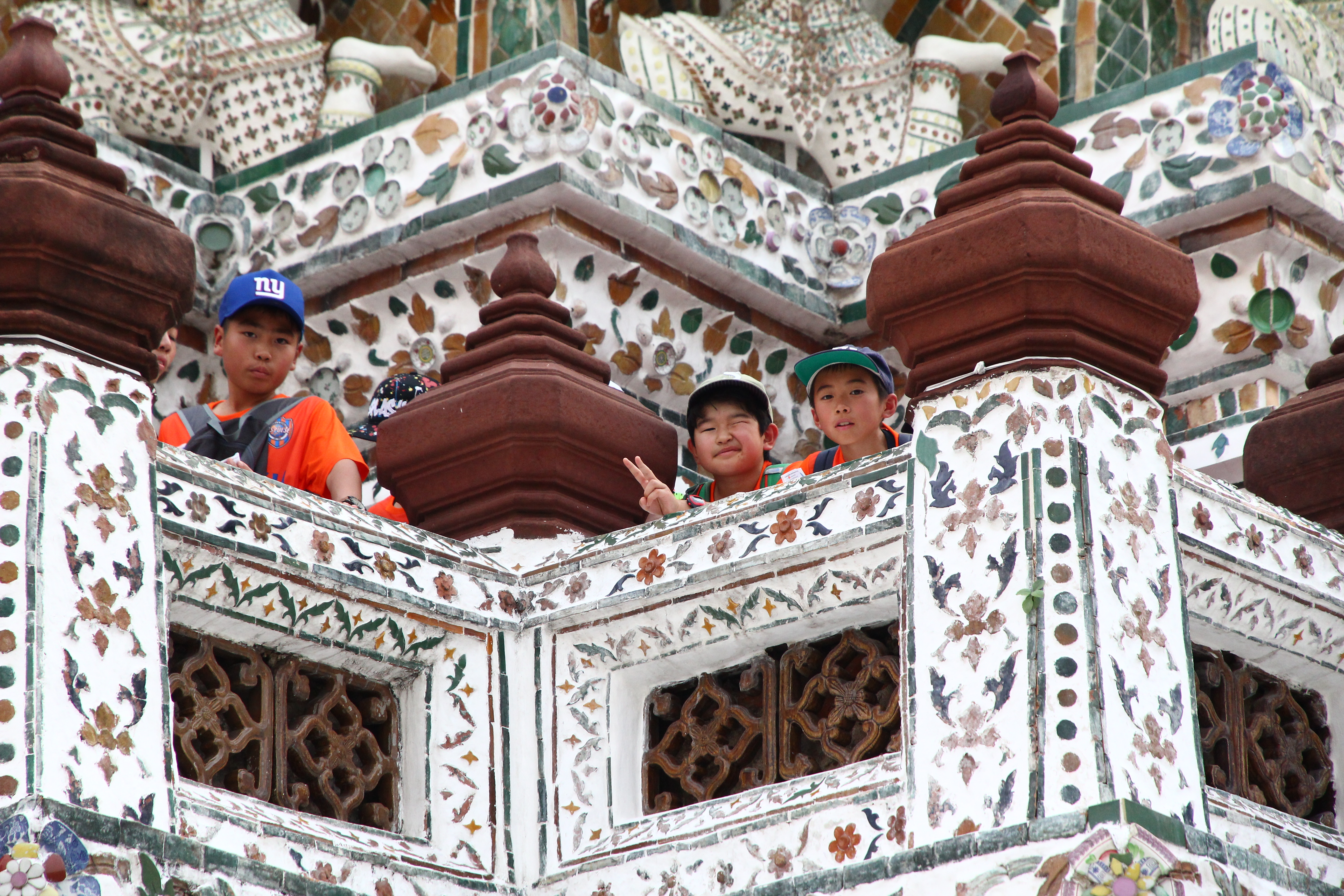 ワットポーでは、全長49メートル、高さ12メートルの寝釈迦仏の寝姿に子供たちも圧倒されていました。そこから、チャオプラヤー川を渡し船に乗って対岸に渡り、ワット・アルンを訪れました。大きな白い仏塔の急な階段を昇り、中腹から塔を一周し、見学を終えました。