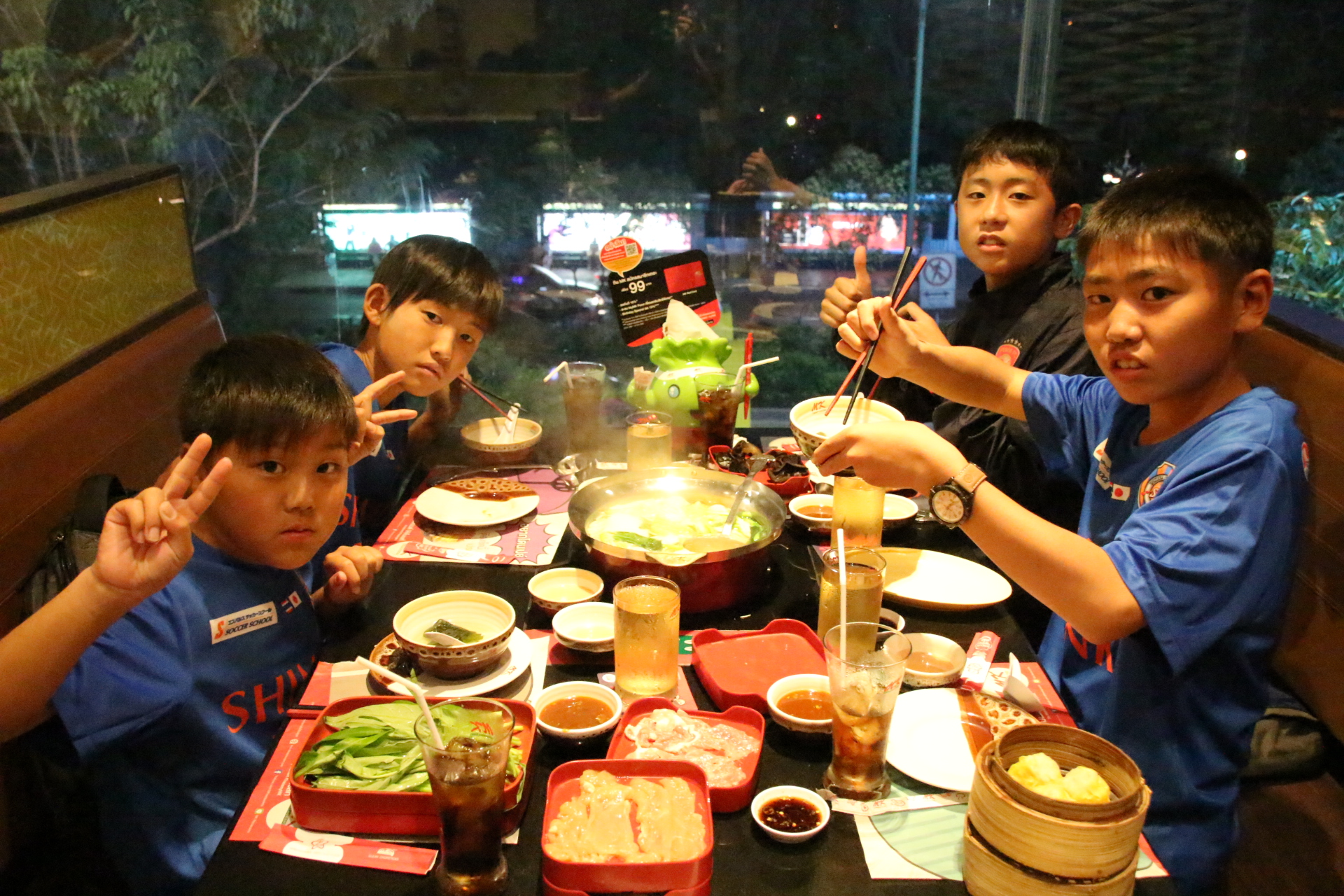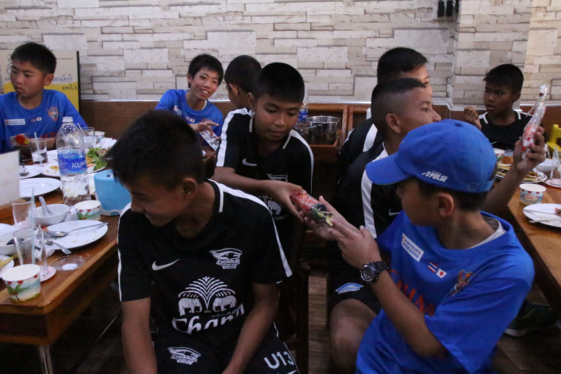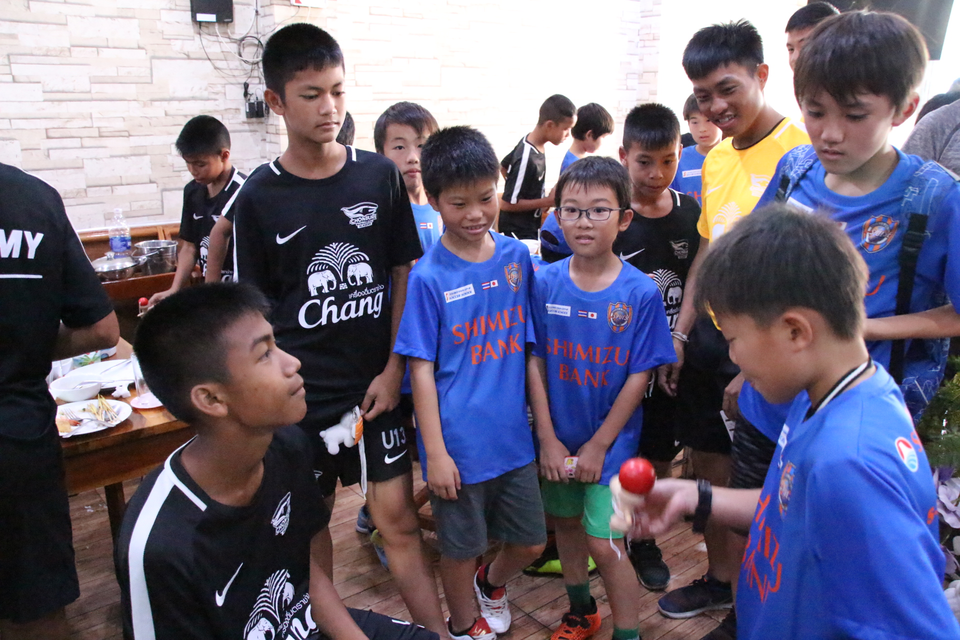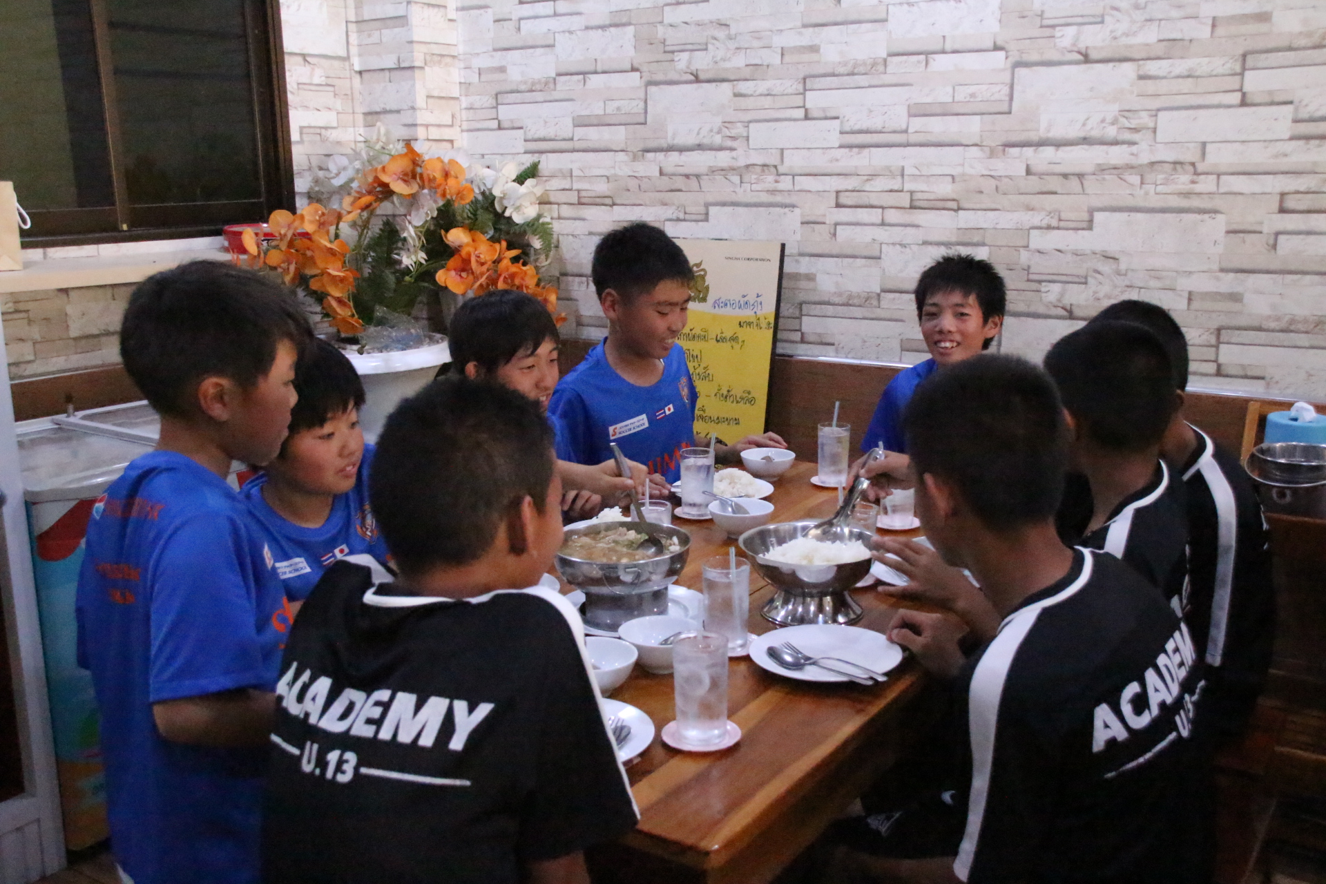 試合後は近隣のタイ料理レストランに場所を移し、相手選手たちと昼食をとりながら交流会を行いました。タイ人の子供たちとの交流は、前日に続いて2回目ということで、積極的にタイ語を覚えようとしながらコミュニケーションを取っていました。最後にプレゼントを渡し、全員で写真撮影を行って、チョンブリーを後にしました。