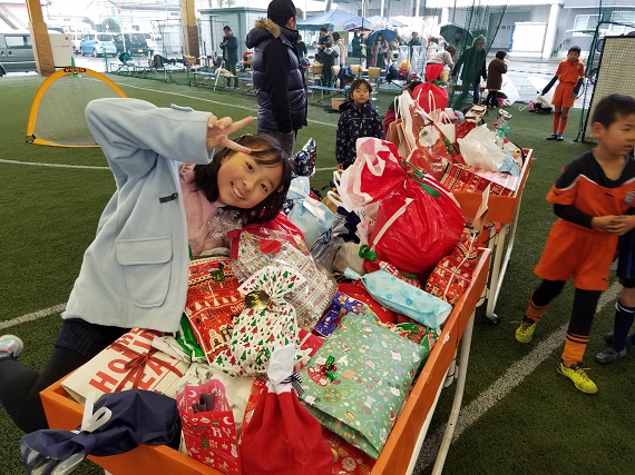 ゲーム大会、サッカーアトラクション(1on1、キックターゲット、スピードガン、サッカーボーリング)、飲食&物販コーナー、抽選会&プレゼント交換会と内容も盛り沢山。サンタやトナカイに扮したコーチ陣や、駿東スクール出身の滝裕太選手も遊びに来てくれました。