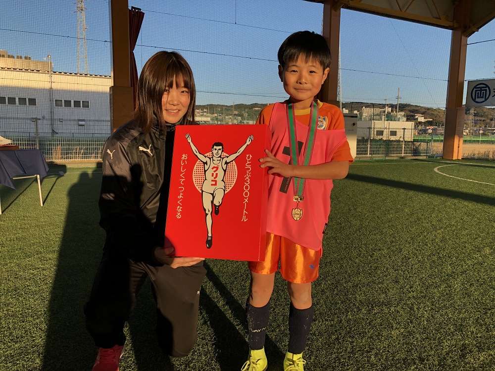 最後に行われた閉会式では、今大会のMVP賞が発表され、大会のスポンサーであるグリコ様より豪華景品が手渡されました。また、参加したスクール生全員にもグリコ様よりお菓子が参加賞としてプレゼントされました。