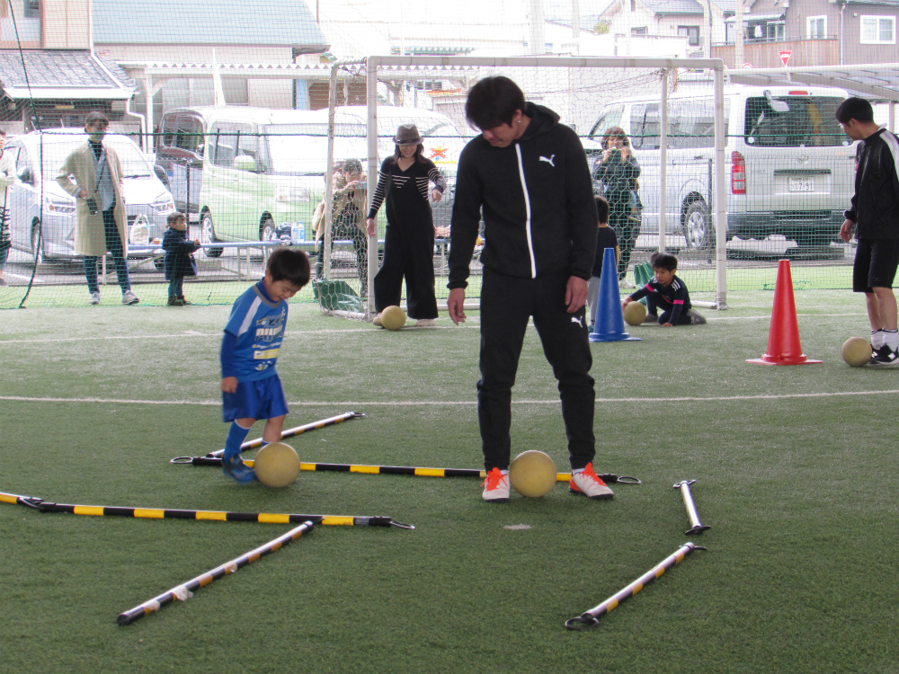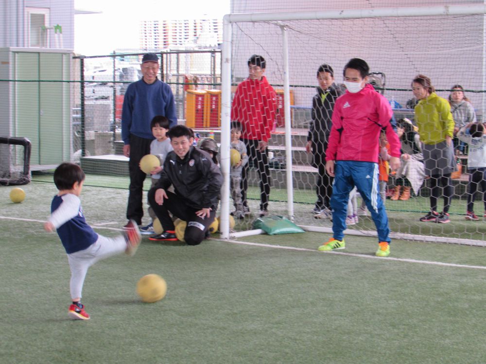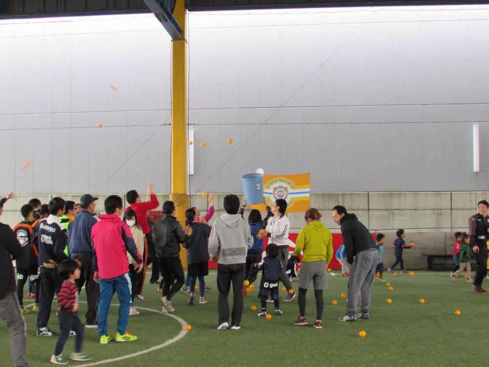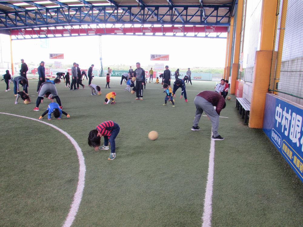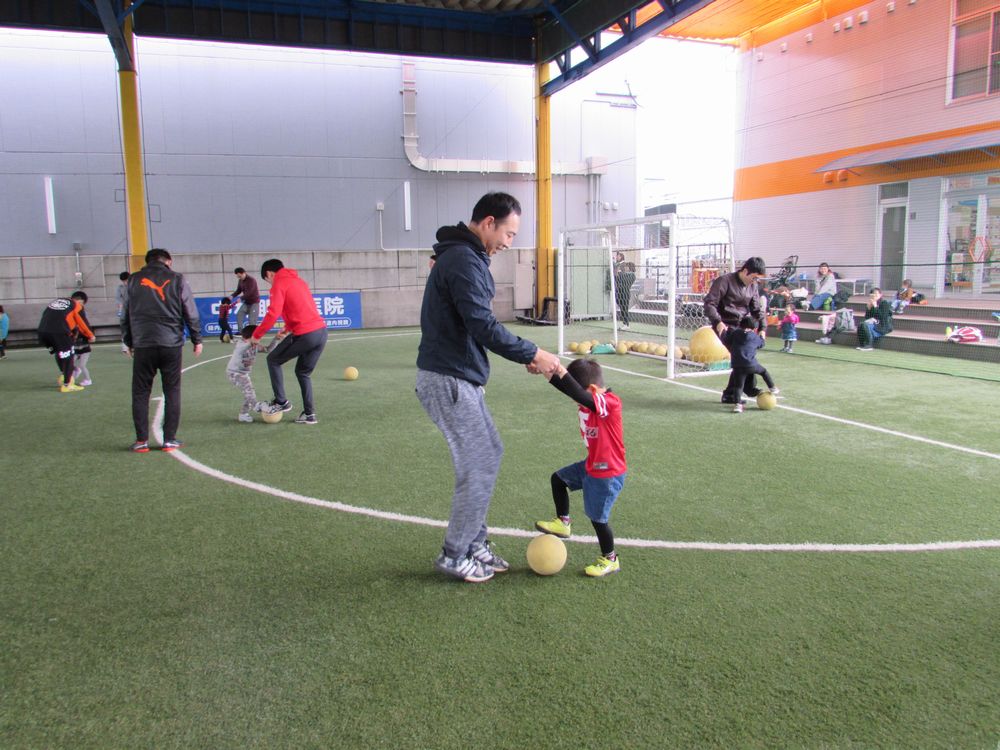 最後は、恒例となるいくつかのセッションに分かれてのアトラクションです。今回も親子でシュート対決や、親子で協力するサーキットは大人気で、何度も挑戦する様子が見られました。また今回新たな種目として、円の中に入った子どもたちが、大人の転がすバランスボールに当たらないように逃げる『爆弾ボール』を行いましたが、これが大人気で、笑顔でずっと遊んでいる子どもたちが多かったです。