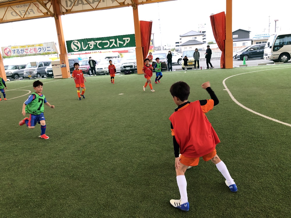 次に行われた試合形式は、「フレンドリーゲーム」です。エスパルスとヴァンフォーレのスクール生をミックスしてチームを作り、試合を行いました。初めにお互いの名前を覚える時間を作り、チームメイトに自己紹介をしてから試合に臨みました。得点が入ったら、ハイタッチをしたり、休憩の時間に新しくチームメイトになった子と話をしたり、中にはあだ名で呼び合っている子もいました。今日初めて出会う子でも、打ち解けるのがすごく早くてびっくりしました。この活動を通して新しい仲間を作れたのではないかと思います。