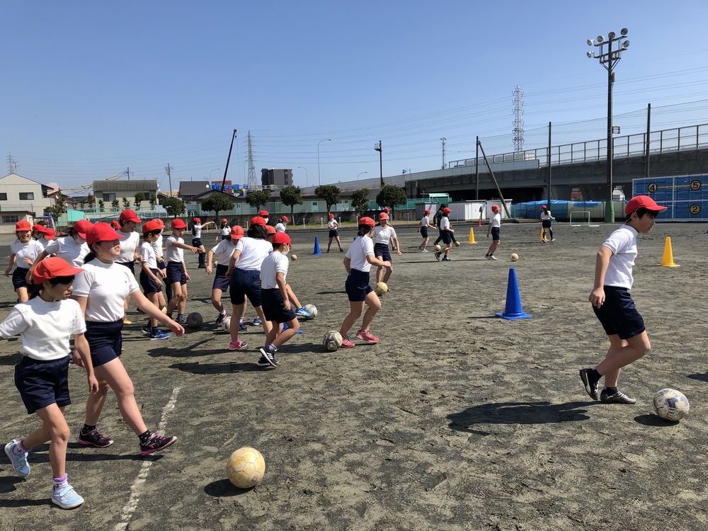 清水飯田東小学校では、前日の雨でグラウンドコンディションがあまり良くなかった事もあり、最初のウォーミングアップは、2人1組のボールフィーリングから始めました。2人1組でのパスゲームではコミュニケーションを取りながら楽しく活動してくれました。最後のミニゲームも全員で楽しんでくれました。