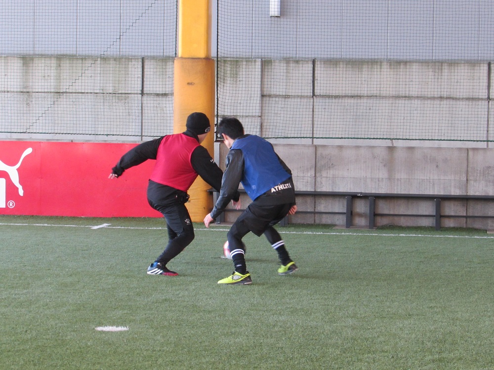 2人組の対面パスやターンの練習、動きながらのコントロールを練習した後は、戦術を入れたシュート練習を行いました。サッカーとは違った動きやパスの仕方で、頭を使いながら動くため、なかなかシュートまでのパスがつながらないという現象が起きましたが、回数を重ねるにつれて、きれいなパスからシュートまでの流れが見られるようになりました。
