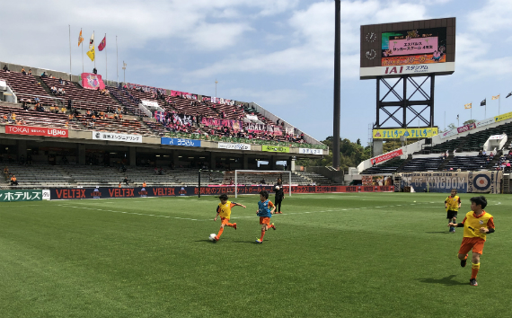 参加してくれたスクール生は天然芝の綺麗なピッチで、ドリブル・パス・シュートなど様々なテクニックを披露してくれました。前座試合終了後には、「もう終わりなの?」「まだサッカーしたいよ」・「楽しかった」・「またサッカーしたい」と話していました。前座試合の最初と最後には、普段のスクールより元気よく挨拶をして、両チームのサポータから拍手をしていただきました。