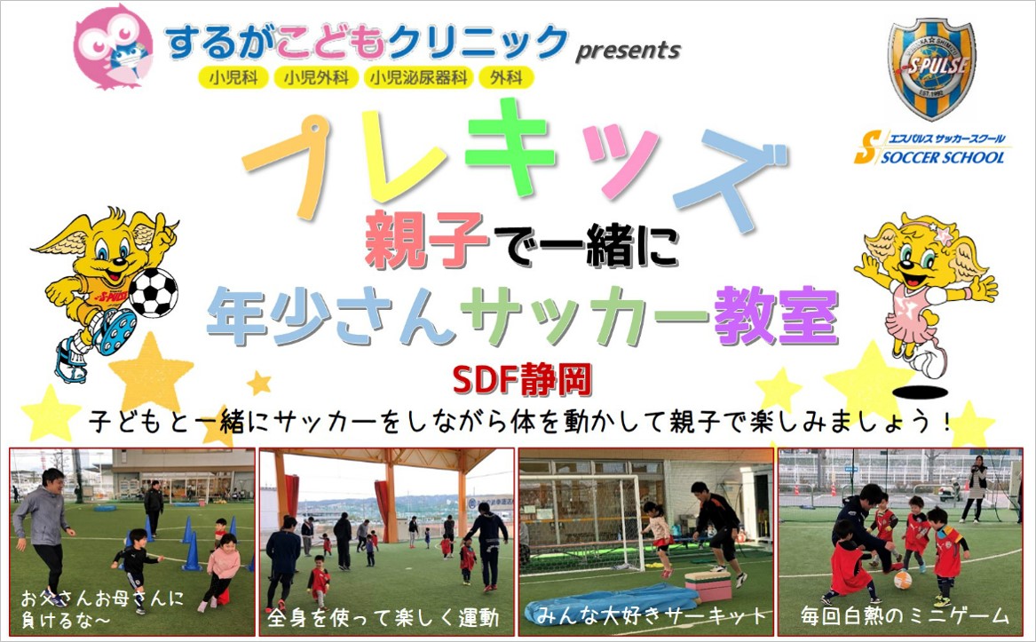 清水エスパルスは、地域事業応援パートナー するがこどもクリニック様ご協力のもと、6月23日(日)にエスパルスドリームフィールド静岡にて、年少児の子ども1名と保護者1名の親子を対象とした『第1回 するがこどもクリニックpresents プレキッズ 親子で一緒に年少さんサッカー教室』を開催いたします。