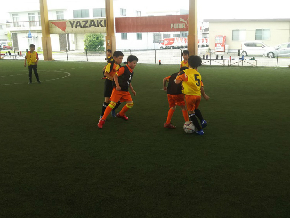 1回目のトレーニングの時は、ボールばかり見てしまってドリブルで相手に突っ込んでしまいボールを取られてしまっていたスクール生が、3回目のトレーニングでは相手、スペースを見ながらプレーし、ドリブルとパスを使い分ける事が出来るようになっていて、3回のスクール通じて成長している様子が伺えました。