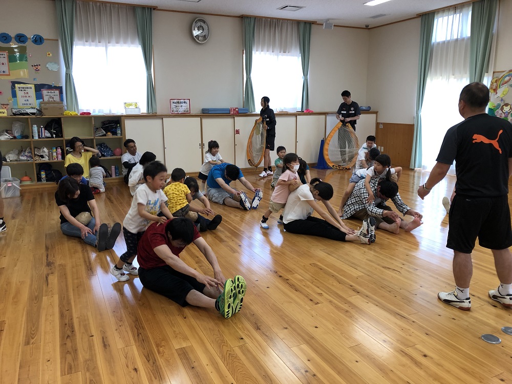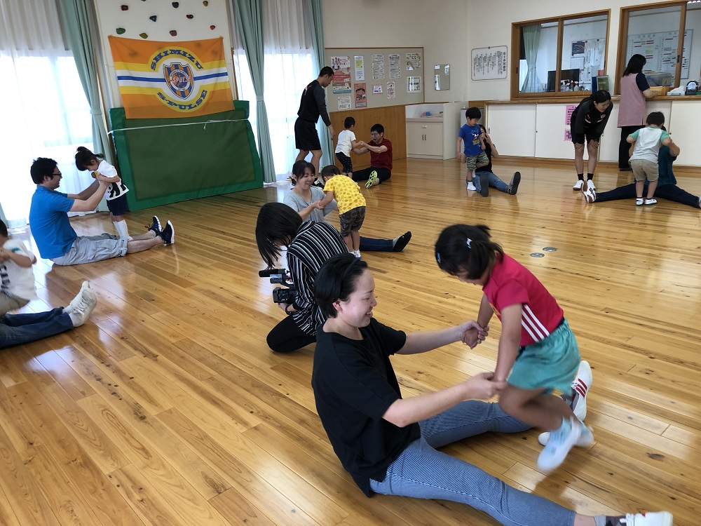 初めは、親子でジャンケンをして負けた方が相手のまわりを1周走ったり、足でジャンケンし、ケンケンで1周走ったりと内容も変えながら行っていきました。しっぽとりでは、保護者にしっぽを付けていただき、子どもがお父さんお母さんのしっぽを真剣に取りに行っている姿が印象的でした。様々な運動遊びを通して、親子でスキンシップをとり、保護者の笑顔も見られたことにコーチたちも嬉しく思いました。