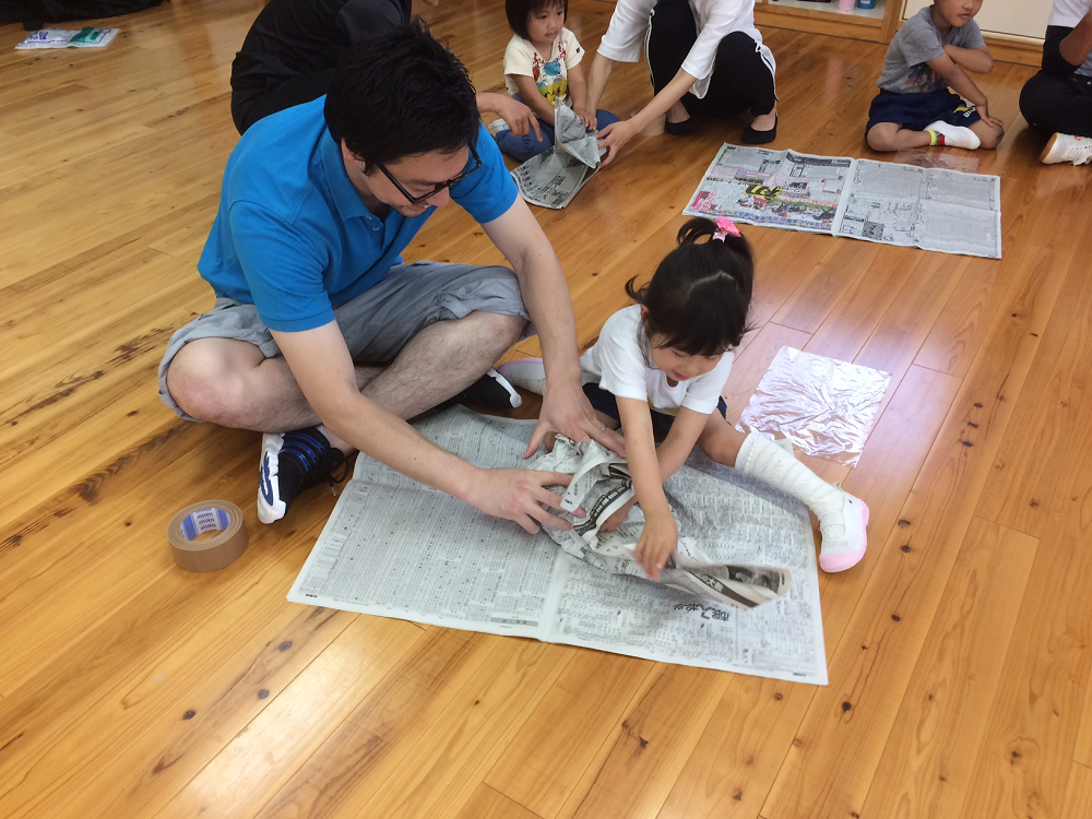 次に、新聞紙を使ってボールを作りました。新聞紙を丸めて、その上からテープを貼って世界でひとつの手作りボールができました。そのボールを使って2人でキャッチボールをした際にコーチから「子どもたちが成功した場合は、大げさに褒めてあげてください」とのレクチャーもあり、親子で協力しながら活動をしていました。また、最後には自分たちが作ったボールで、保護者との1対1対決で汗を流しました。そしてあっという間に1時間の教室が終了しました。