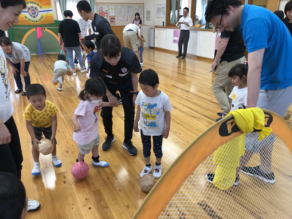 当日は、富士市内の元気な親子10組が参加し、エスパルスサッカースクールから、今泉幸広教育事業部長兼スクールマスター、森田祐史コーチ、萩原豊之コーチ、深澤沙季コーチ、小川奈津美コーチの5名が参加し、一緒に楽しく活動しました。