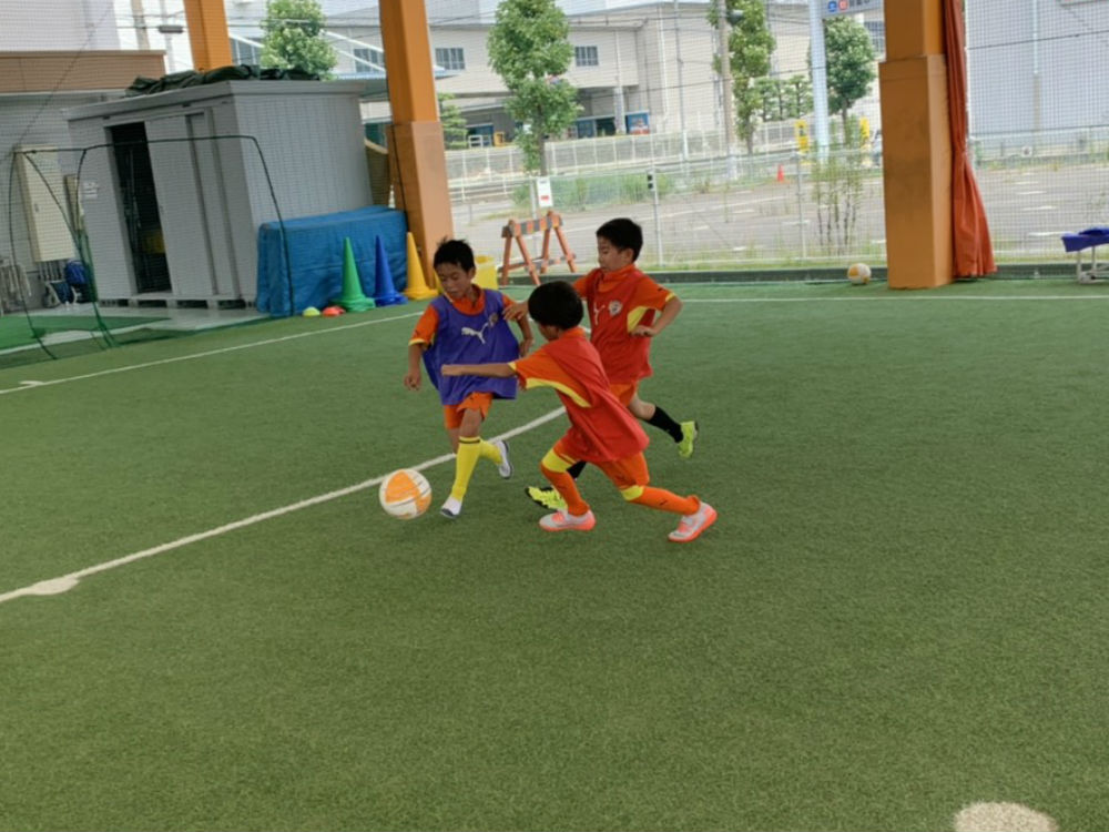 2つ目の対決はゴールの隅にコーンを置き、倒したり当たったりしたポイント制で対決を行いました。2日目にはフェイントも練習をし、ドリブルやフェイントで相手をかわしてからシュートをしました。1日目よりも2日目の方がシュートもだんだんと強く蹴れるようになっていく変化を感じることができました。