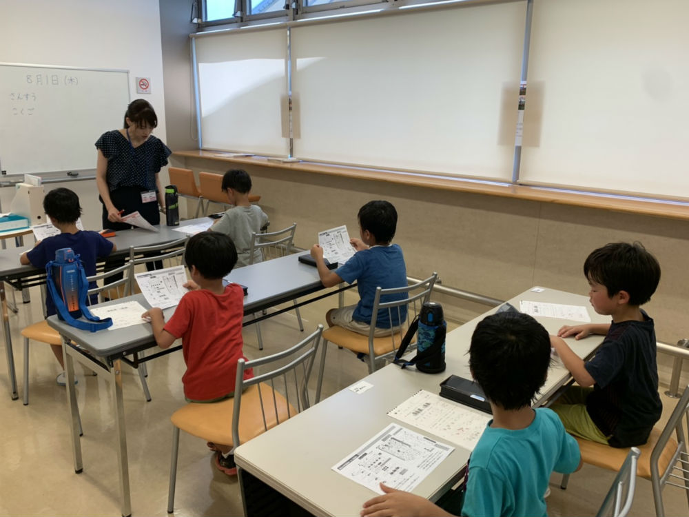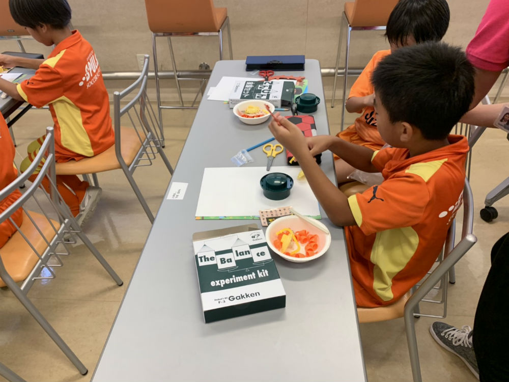 学研教室は1日目に「夏の科学実験教室」、2日目は「算数と国語の教材体験」を行いました。夏の科学実験では、実験キットのてんびんを使った実験をしました。てんびんを使って重さを予想したり、内側や外側など重さをかける場所によっても変化があることを発見したり、どうしたら釣り合うのかなど1人1人が真剣に考え、楽しみながら活動をしていたように感じました。2日目の教材体験では算数と国語の勉強をしました。とても集中した雰囲気で、真剣に教材に取り組んでいました。1枚終わったら学研教室の先生に見てもらい、1つも間違えなかったと嬉しそうに話している子もいました。「サッカーで疲れたけど、もう1枚やる!」と意欲的に取り組んでいて、先生も驚いていました。