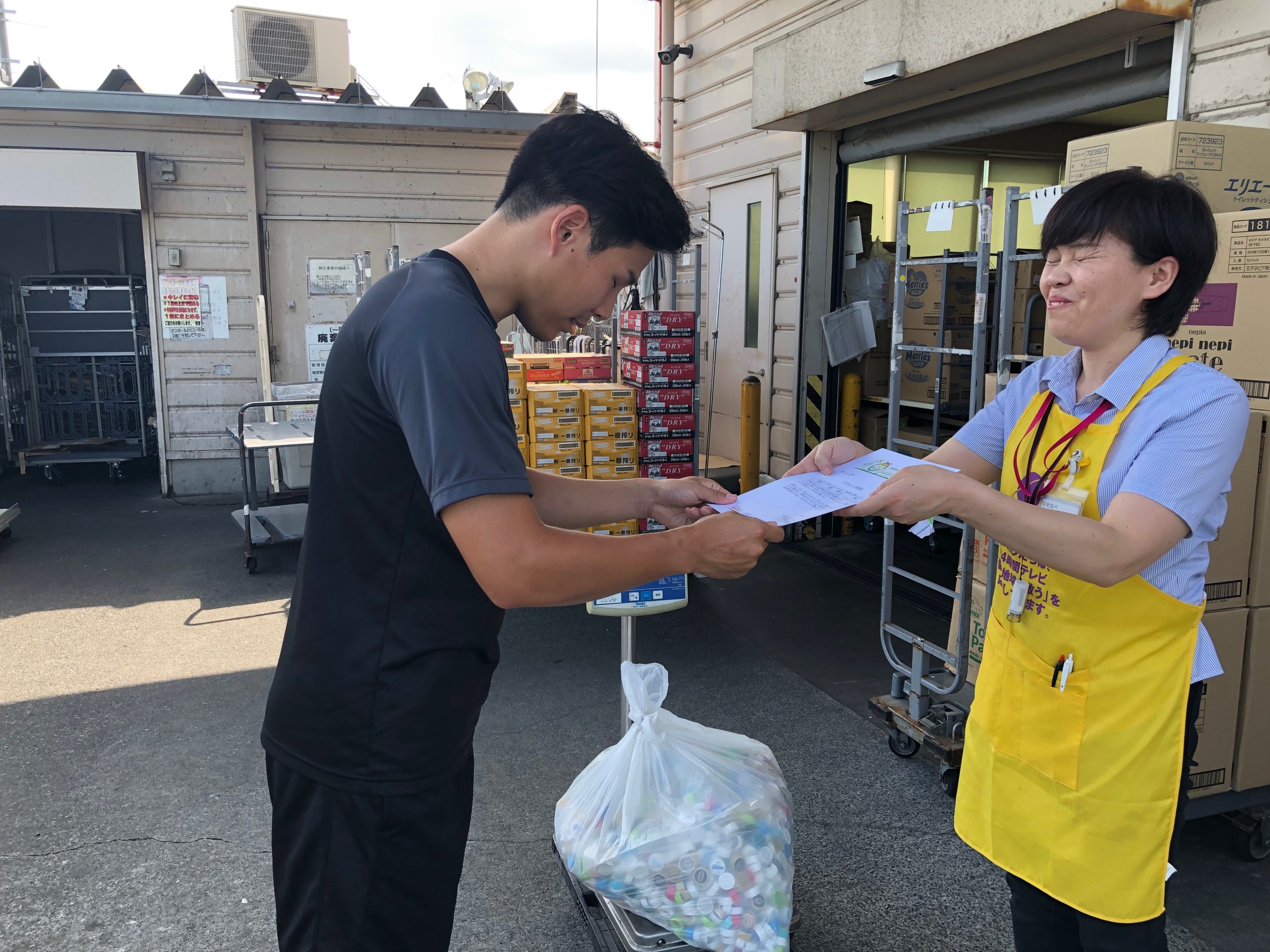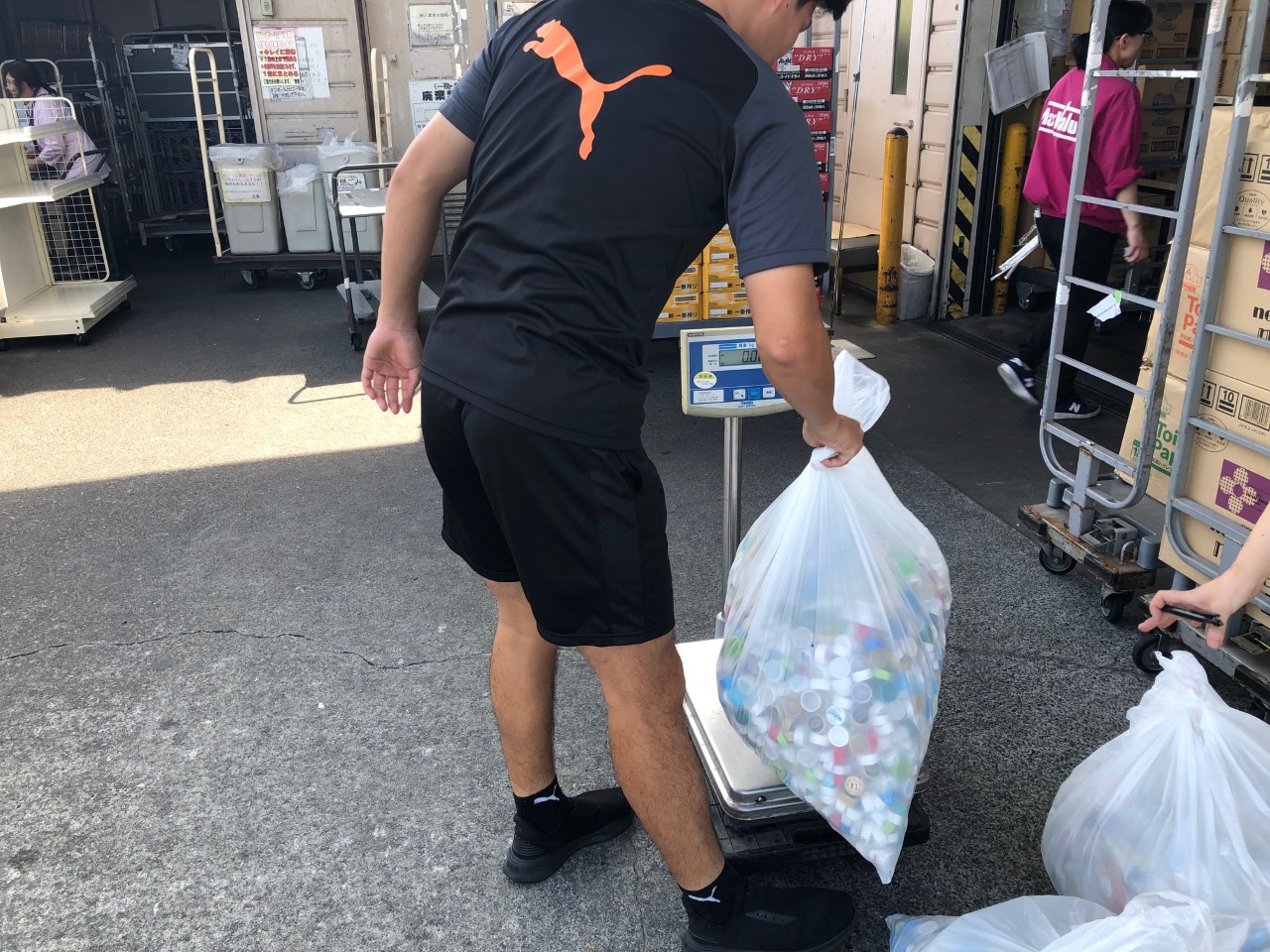 8月8日(金)に、エスパルスドリームフィールド清水で皆さまに分別のご協力をいただいているペットボトルキャップの計測をマックスバリュー清水興津店にて行いました。