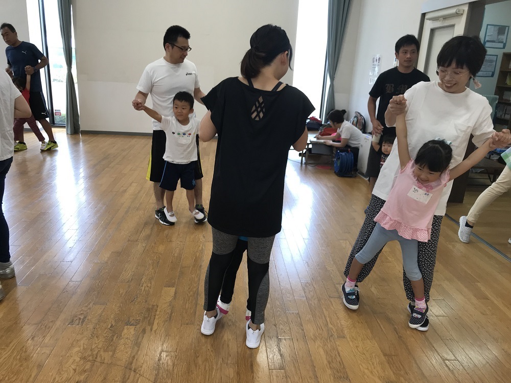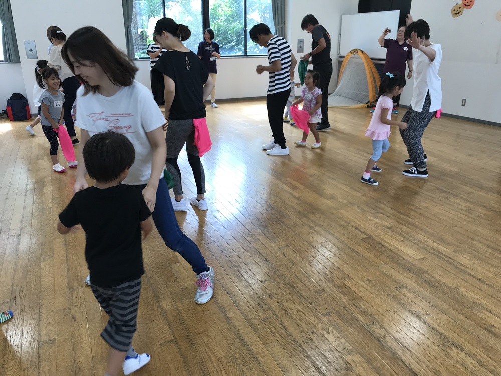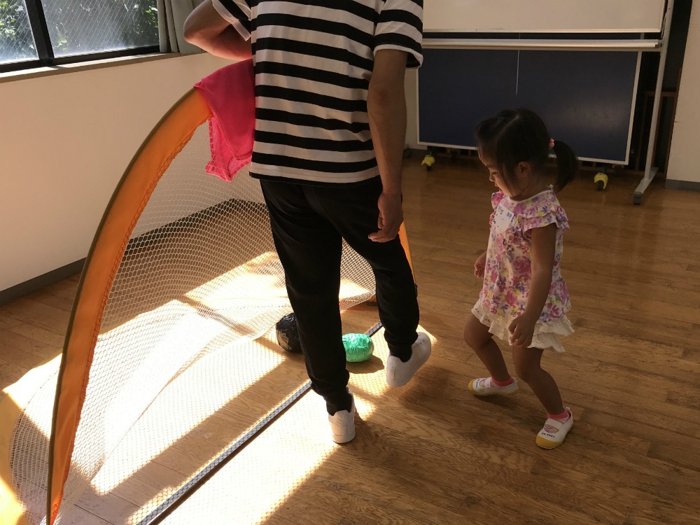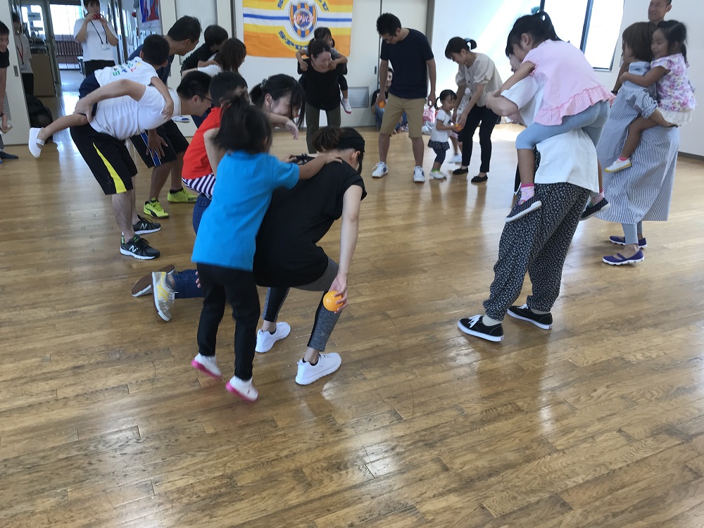 親子でできる運動遊びのメニューから、保護者の足の上に子どもの足を乗せ人間ロボットで動いたり、保護者が長座している周りを走りながらジャンプしたり、保護者のしっぽを取ったりする遊びを行いました。また、親子で協力して作ったボールでキャッチボールをしたり、保護者が作った腕の輪をバスケットのリングに見立て、バスケットのようにボールを投げて入れたりと終始笑顔で活動していました。そして最後はサッカー親子対決で、気持ちの良い汗を流しました。