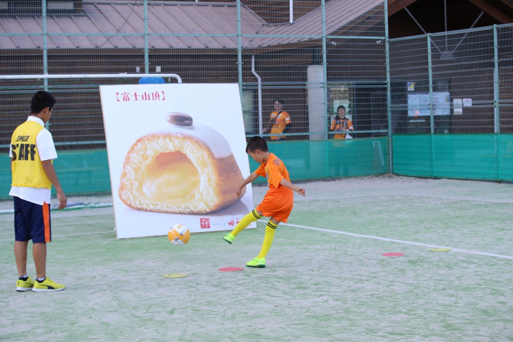 「テニスコートイベント」では、『田子の月もなかスポーツパーク』と題して、田子の月商品の販売や、たくさんの家族とふれあう親子同士の協力イベントとして「手つなぎドリブル」「目隠しドリブルシュート」「ボール運びリレー」「背中合わせリレー」の4つのサッカーアトラクションと、ナンバーワン親子を決めるキックターゲットと富士山頂キングを合わせた6つのアトラクションに挑戦しました。また今年もテニス協会様にご協力いただいたテニス体験コーナーや、ガネーシャ静岡様のご協力によるアンプティサッカー体験コーナーは大盛況で、駐車場は静岡市こどもクリエイティブタウンま・あ・る様によるふわふわバルーン・ダンボール迷路でテニスコートを盛り上げていただきました。